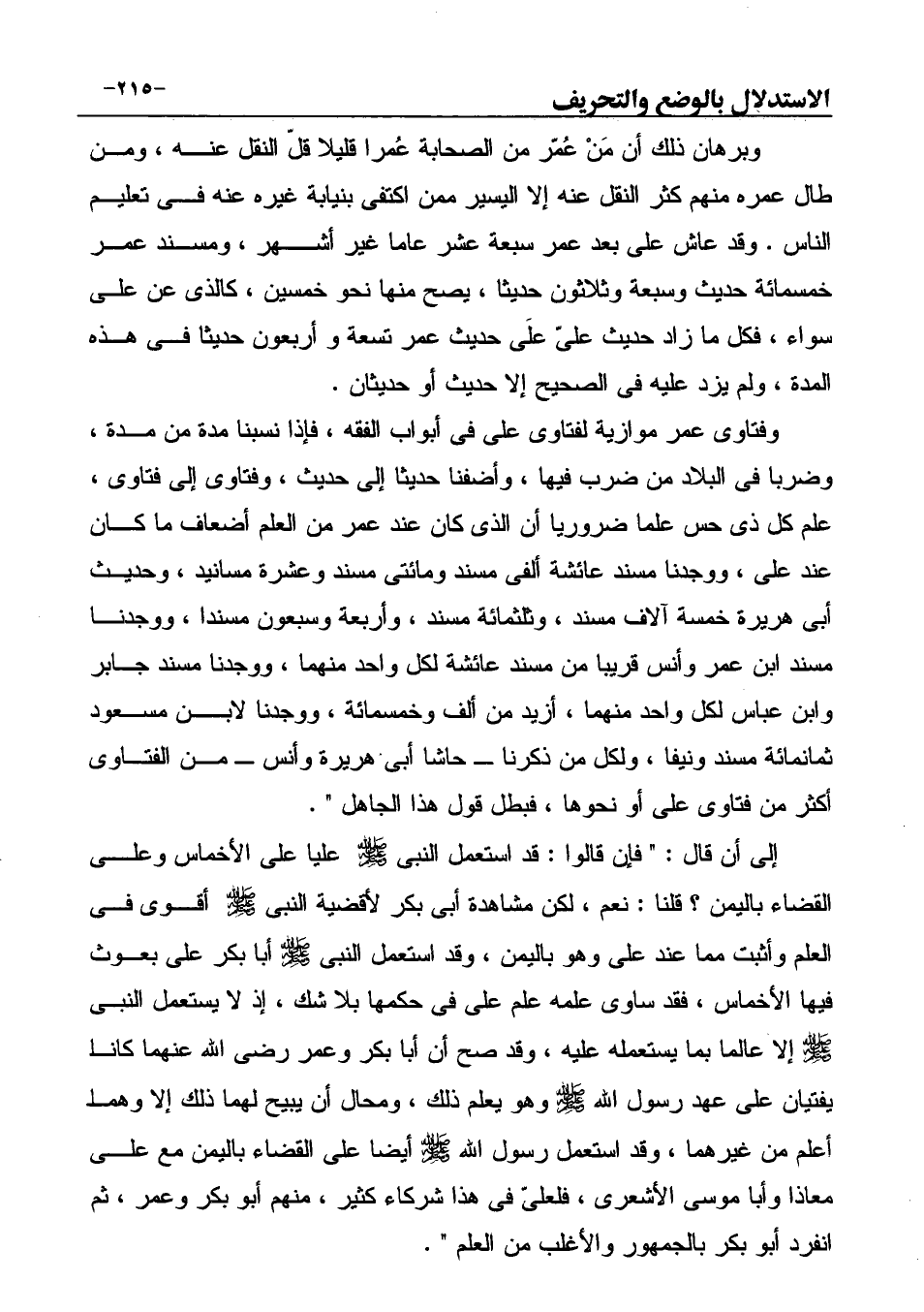 إلى أن قال: " فإن قالوا: قد استعمل النبي صَلَّى اللهُ عَلَيْهِ وَسَلَّمَ عليا على الأخماس وعلى القضاء باليمن؟ قلنا: نعم، لكن مشاهدة أبى بكر لأقضية النبي صَلَّى اللهُ عَلَيْهِ وَسَلَّمَ أقوى في العلم وأثبت مما عند على وهو باليمن، وقد استعمل النبي صَلَّى اللهُ عَلَيْهِ وَسَلَّمَ أبا بكر على بعوث فيها الأخماس، فقد ساوى علمه علم على في حكمها بلا شك، إذ لا يستعمل النبي صَلَّى اللهُ عَلَيْهِ وَسَلَّمَ إلا عالما بما يستعمله عليه، وقد صح أن أبا بكر وعمر رضي الله عنهما كانا يفتيان على عهد رسول الله صَلَّى اللهُ عَلَيْهِ وَسَلَّمَ وهو يعلم ذلك، ومحال أن يبيح لهما ذلك إلا وهما أعلم من غيرهما، وقد استعمل رسول الله صَلَّى اللهُ عَلَيْهِ وَسَلَّمَ أيضا على القضاء باليمن مع على معاذا وأبا موسى الأشعرى، فلعلىّ في هذا شركاء كثير، منهم أبو بكر وعمر، ثم انفرد أبو بكر بالجمهور والأغلب من العلم ".