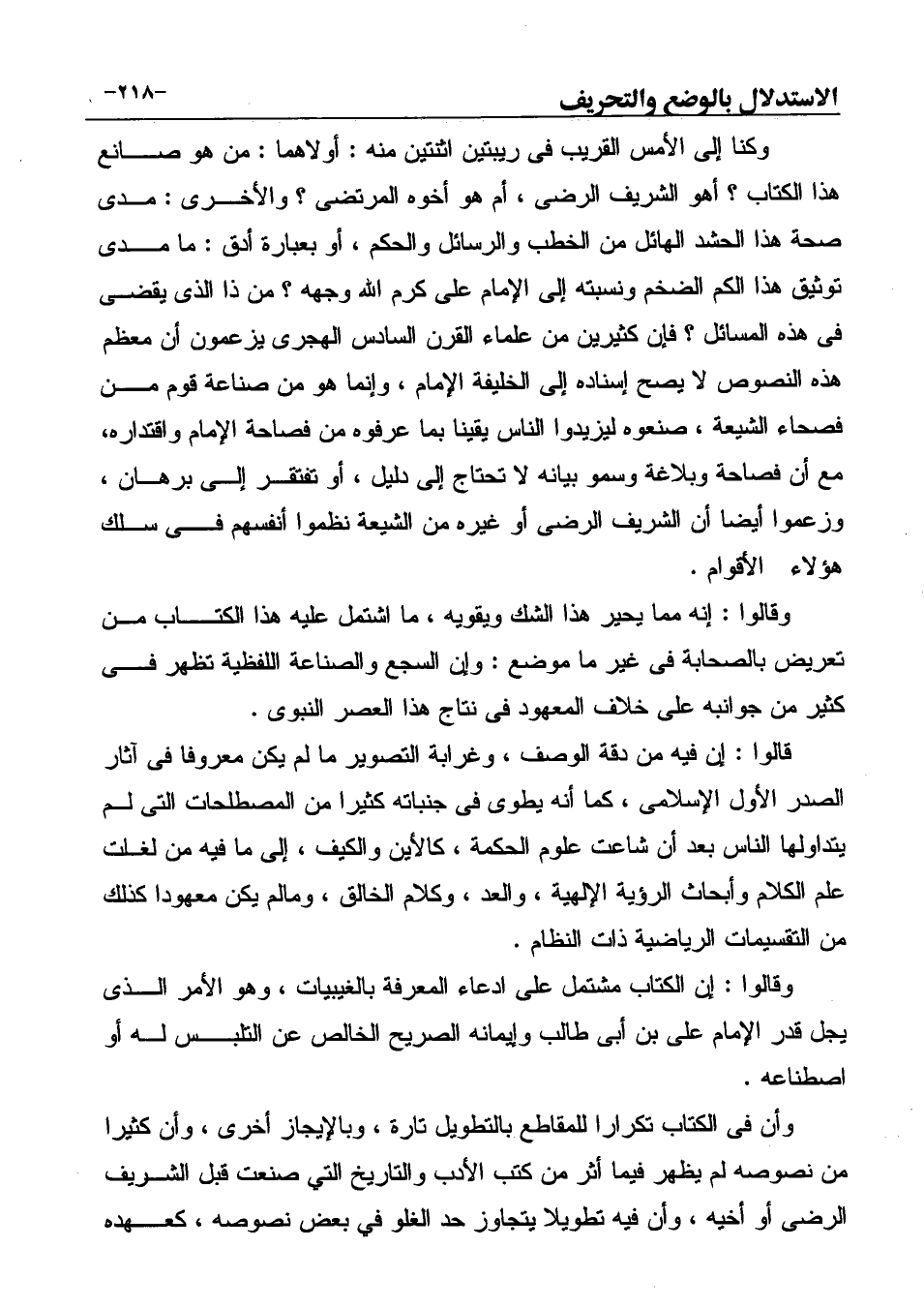 وكنا إلى الأمس القريب في ريبتين اثنتين منه: أولاهما: من هو صانع هذا الكتاب؟ أهو الشريف الرضى، أم هو أخوه المرتضى؟ والأخرى: مدى صحة هذا الحشد الهائل من الخطب والرسائل والحكم، أو بعبارة أدق: ما مدى توثيق هذا الكم الضخم ونسبته إلى الإمام على كرم الله وجهه؟ من ذا الذي يقضى في هذه المسائل؟ فإن كثيرين من علماء القرن السادس الهجرى يزعمون أن معظم هذه النصوص لا يصح إسناده إلى الخليفة الإمام، وإنما هو من صناعة قوم من فصحاء الشيعة، صنعوه ليزيدوا الناس يقينا بما عرفوه من فصاحة الإمام واقتداره، مع أن فصاحة وبلاغة وسمو بيانه لا تحتاج إلى دليل، أو تفتقر إلى برهان، وزعموا أيضا أن الشريف الرضى أو غيره من الشيعة نظموا أنفسهم في سلك هؤلاء الأقوام.