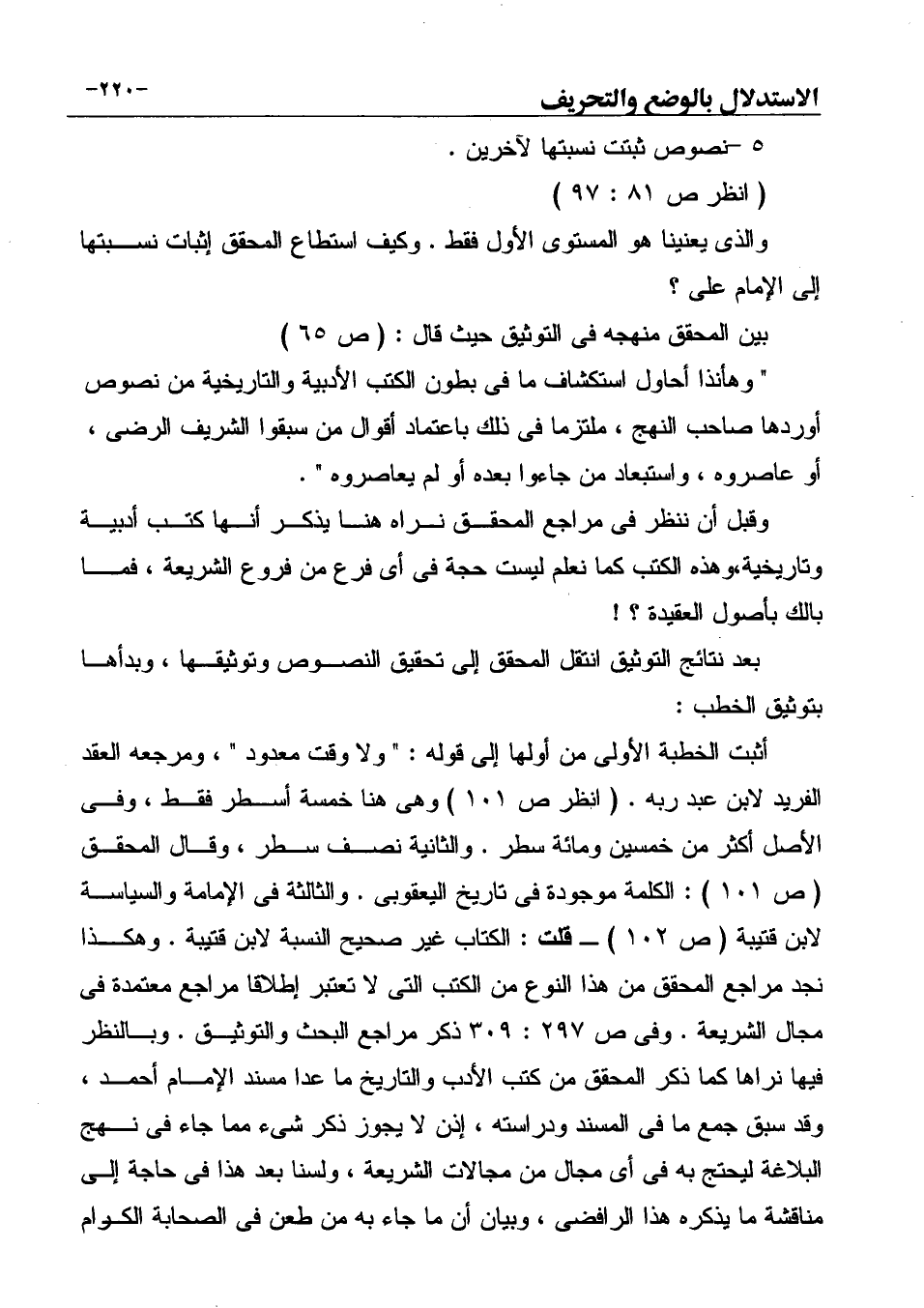 أثبت الخطبة الأولى من أولها إلى قوله: " ولا وقت معدود "، ومرجعه العقد الفريد لابن عبد ربه. (انظر ص 101) وهى هنا خمسة أسطر فقط، وفى الأصل أكثر من خمسين ومائة سطر. والثانية نصف سطر، وقال المحقق (ص 101) : الكلمة موجودة في تاريخ اليعقوبى. والثالثة في الإمامة والسياسة لابن قتيبة (ص 102) ـ قلت: الكتاب غير صحيح النسبة لابن قتيبة. وهكذا نجد مراجع المحقق من هذا النوع من الكتب التي لا تعتبر إطلاقا مراجع معتمدة في مجال الشريعة. وفى ص 297: 309 ذكر مراجع البحث والتوثيق. وبالنظر فيها نراها كما ذكر المحقق من كتب الأدب والتاريخ ما عدا مسند الإمام أحمد، وقد سبق جمع ما في المسند ودراسته، إذن لا يجوز ذكر شىء مما جاء في نهج البلاغة ليحتج به في أي مجال من مجالات الشريعة، ولسنا بعد هذا في حاجة إلى مناقشة ما يذكره هذا الرافضي، وبيان أن ما جاء به من طعن في الصحابة الكرام