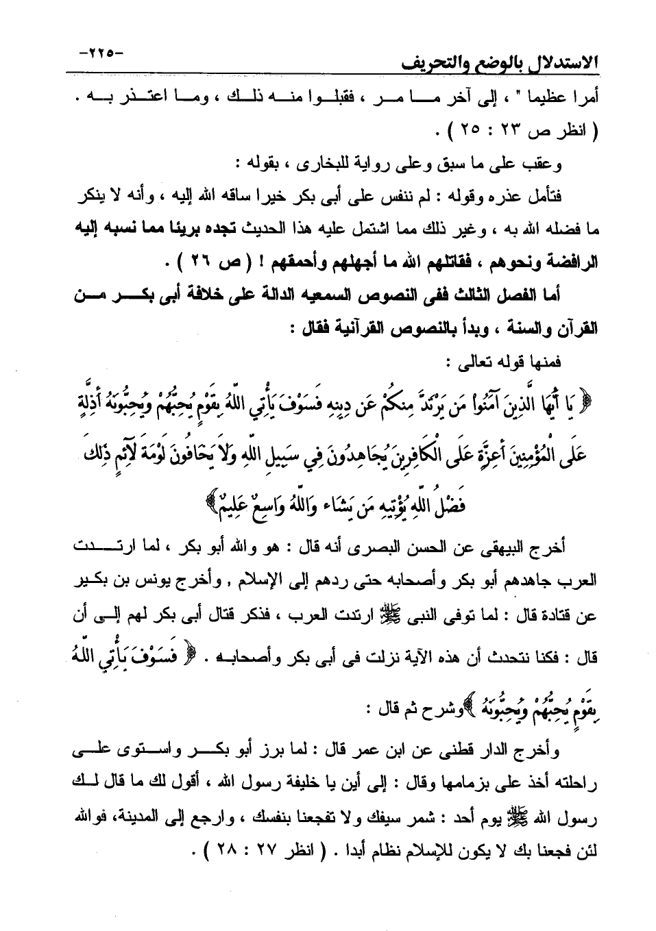 أما الفصل الثالث ففي النصوص السمعية الدالة على خلافة أبى بكر من القرآن والسنة، وبدأ بالنصوص القرآنية فقال: