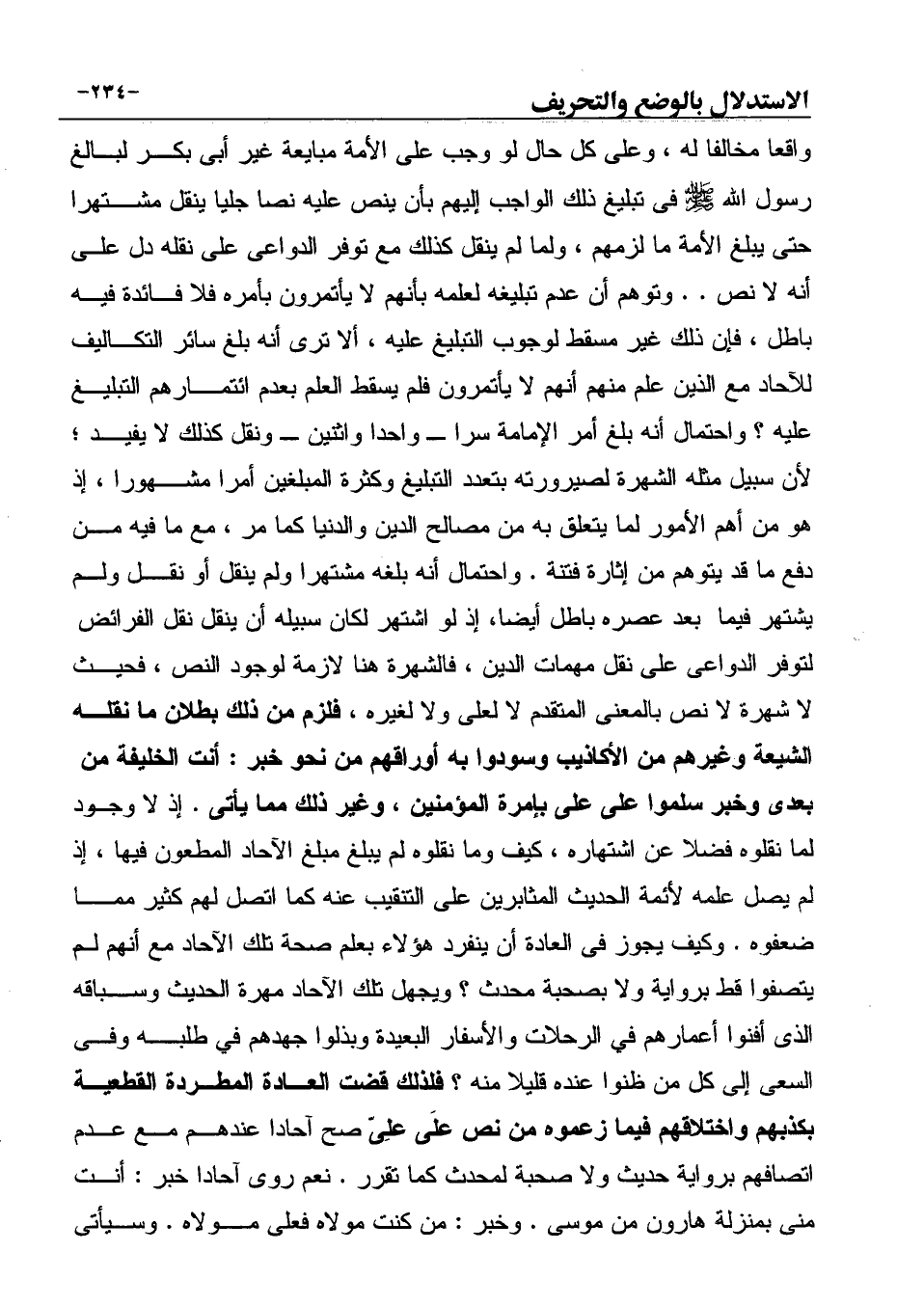 واحتمال أنه بلغه مشتهرا ولم ينقل أو نقل ولم يشتهر فيما بعد عصره باطل أيضا، إذ لو اشتهر لكان سبيله أن ينقل نقل الفرائض لتوفر الدواعى على نقل مهمات الدين، فالشهرة هنا لازمة لوجود النص، فحيث لا شهرة لا نص بالمعنى المتقدم لا لعلى ولا لغيره، فلزم من ذلك بطلان ما نقله الشيعة وغيرهم من الأكاذيب وسودوا به أوراقهم من نحو خبر: أنت الخليفة من بعدى وخبر سلموا على على بإمرة المؤمنين، وغير ذلك مما يأتي. إذ لا وجود لما نقلوه فضلا عن اشتهاره، كيف وما نقلوه لم يبلغ مبلغ الآحاد المطعون فيها، إذ لم يصل علمه لأئمة الحديث المثابرين على التنقيب عنه كما اتصل لهم كثير مما ضعفوه. وكيف يجوز في العادة أن ينفرد هؤلاء بعلم صحة تلك الآحاد مع أنهم لم يتصفوا قط برواية ولا بصحبة محدث؟ ويجهل تلك الآحاد مهرة الحديث وسباقه الذي أفنوا أعمارهم في الرحلات والأسفار البعيدة وبذلوا جهدهم في طلبه وفى السعى إلى كل من ظنوا عنده قليلا منه؟ فلذلك قضت العادة المطردة القطعية بكذبهم واختلاقهم فيما زعموه من نص علَى علِىّ صح آحادا عندهم مع عدم اتصافهم برواية حديث ولا صحبة لمحدث كما تقرر. نعم روى آحادا خبر: أنت منى بمنزلة هارون من موسى. وخبر: من كنت مولاه فعلى مولاه. وسيأتي