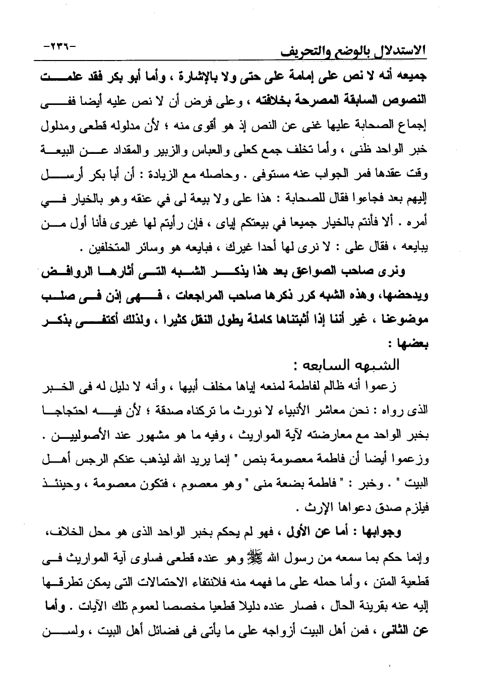 ونرى صاحب الصواعق بعد هذا يذكر الشبه التي أثارها الروافض ويدحضها، وهذه الشبه كرر ذكرها صاحب المراجعات، فهى إذن في صلب موضوعنا، غير أننا إذا أثبتناها كاملة يطول النقل كثيرا، ولذلك أكتفى بذكر بعضها: