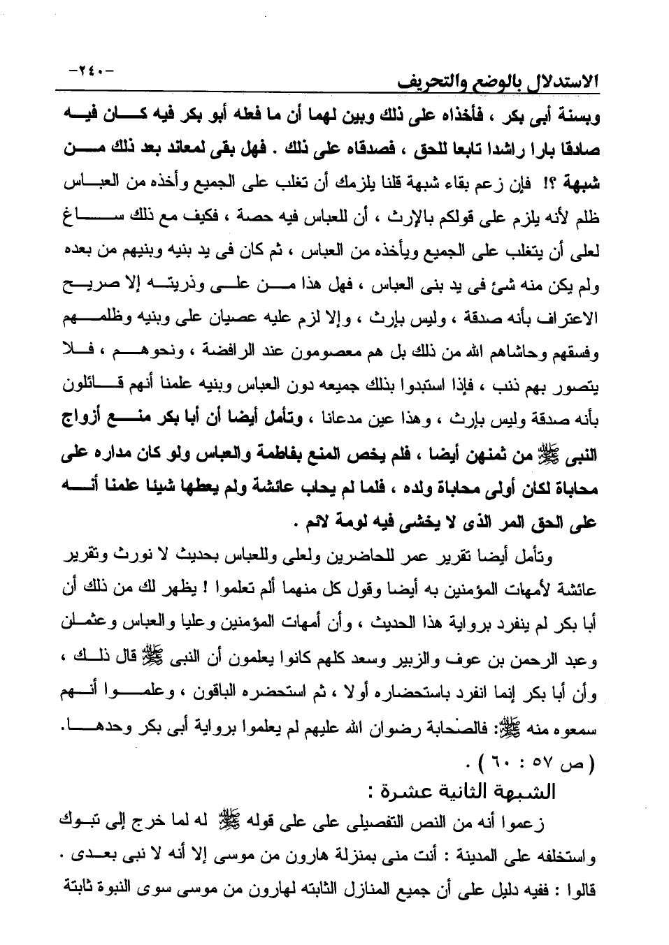 وبسنة أبى بكر، فأخذاه على ذلك وبين لهما أن ما فعله أبو بكر فيه كان فيه صادقا باراً راشداً تابعاً للحق، فصدقاه على ذلك. فهل بقى لمعاند بعد ذلك من شبهة؟! فإن زعم بقاء شبهة قلنا يلزمك أن تغلب على الجميع وأخذه من العباس ظلم لأنه يلزم على قولكم بالإرث، أن للعباس فيه حصة، فكيف مع ذلك ساغ لعلى أن يتغلب على الجميع ويأخذه من العباس، ثم كان في يد بنيه وبنيهم من بعده ولم يكن منه شئ في يد بنى العباس، فهل هذا من على وذريته إلا صريح الاعتراف بأنه صدقة، وليس بإرث، وإلا لزم عليه عصيان على وبنيه وظلمهم وفسقهم وحاشاهم الله من ذلك بل هم معصومون عند الرافضة، ونحوهم، فلا يتصور بهم ذنب، فإذا استبدوا بذلك جميعه دون العباس وبنيه علمنا أنهم قائلون بأنه صدقة وليس بإرث، وهذا عين مدعانا، وتأمل أيضا أن أبا بكر منع أزواج النبي صَلَّى اللهُ عَلَيْهِ وَسَلَّمَ من ثمنهن أيضا، فلم يخص المنع بفاطمة والعباس ولو كان مداره على محاباة لكان أولى محاباة ولده، فلما لم يحاب عائشة ولم يعطها شيئا علمنا أنه على الحق المر الذي لا يخشى فيه لومة لائم.