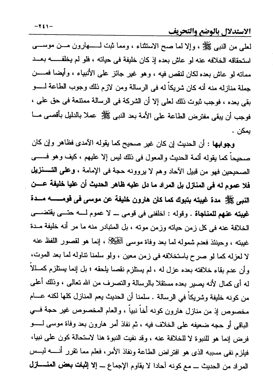 سلمنا أن الحديث يعم المنازل كلها لكنه عام مخصوص إذ من منازل هارون كونه أخاً نبياً، والعام المخصوص غير حجة في الباقى أو حجه ضعيفه على الخلاف فيه، ثم نفاذ أمر هارون بعد وفاة موسى لو فرض إنما هو للنبوة لا للخلافة عنه، وقد نفيت النبوة هنا لاستحالة كون على نبيا، فيلزم نفى مسببه الذي هو افتراض الطاعة ونفاذ الأمر، فعلم مما تقرر أنه ليس المراد من الحديث ـ مع كونه آحادا لا يقاوم الإجماع ـ إلا إثبات بعض المنازل