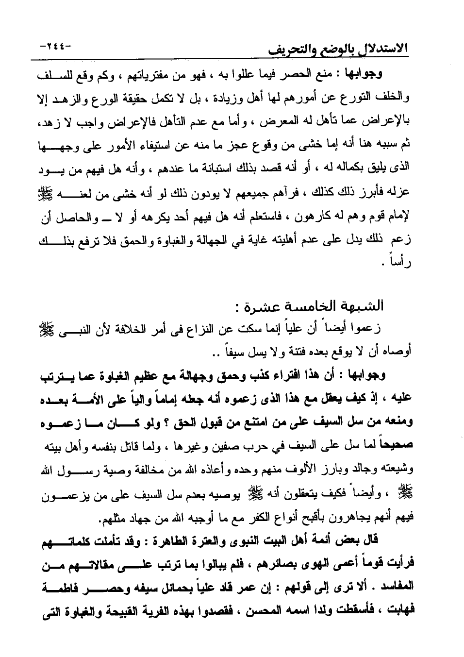 وجوابها: أن هذا افتراء كذب وحمق وجهالة مع عظيم الغباوة عما يترتب عليه، إذ كيف يعقل مع هذا الذي زعموه أنه جعله إماماً والياً على الأمة بعده ومنعه من سل السيف على من امتنع من قبول الحق؟ ولو كان ما زعموه صحيحاً لما سل على السيف في حرب صفين وغيرها، ولما قاتل بنفسه وأهل بيته وشيعته وجالد وبارز الألوف منهم وحده وأعاذه الله من مخالفة وصية رسول الله صَلَّى اللهُ عَلَيْهِ وَسَلَّمَ، وأيضاً فكيف يتعقلون أنه صَلَّى اللهُ عَلَيْهِ وَسَلَّمَ يوصيه بعدم سل السيف على من يزعمون فيهم أنهم يجاهرون بأقبح أنواع الكفر مع ما أوجبه الله من جهاد مثلهم.