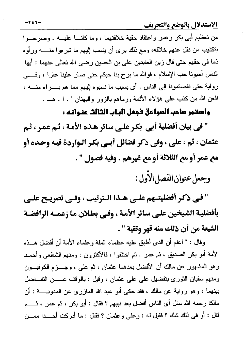 " في ذكر أفضليتهم على هذا الترتيب، وفى تصريح على بأفضلية الشيخين على سائر الأمة، وفى بطلان ما زعمه الرافضة الشيعة من أن ذلك منه قهر وتقية ".