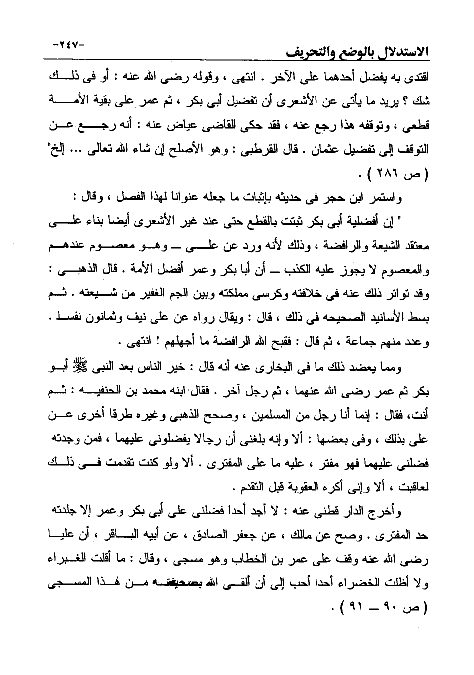 وأخرج الدار قطنى عنه: لا أجد أحداً فضلنى على أبى بكر وعمر إلا جلدته حد المفترى. وصح عن مالك، عن جعفر الصادق، عن أبيه الباقر، أن عليا رضي الله عنه وقف على عمر بن الخطاب وهو مسجى، وقال: ما أقلت الغبراء ولا أظلت الخضراء أحداً أحب إلى أن ألقى الله بصحيفته من هذا المسجى (ص 90 ـ 91) .