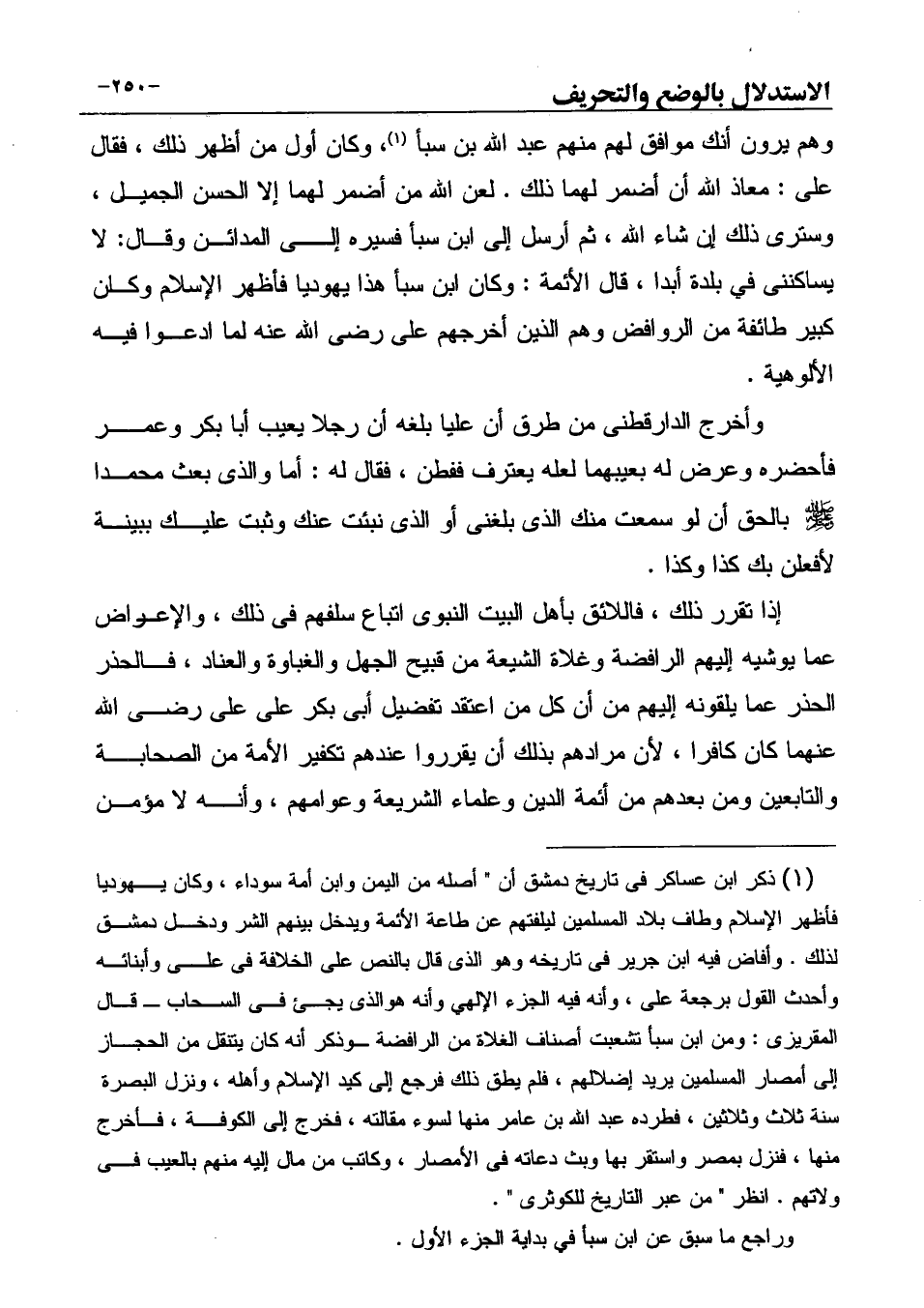 (¬1) ذكر ابن عساكر في تاريخ دمشق أن " أصله من اليمن وابن أمة سوداء، وكان يهوديا فأظهر الإسلام وطاف بلاد المسلمين ليلفتهم عن طاعة الأئمة ويدخل بينهم الشر ودخل دمشق لذلك..وأفاض فيه ابن جرير في تاريخه وهو الذي قال بالنص على الخلافة في على وأبنائه وأحدث القول برجعة على، وأنه فيه الجزء الإلهي وأنه هوالذى يجئ في السحاب ـ قال المقريزى: ومن ابن سبأ تشعبت أصناف الغلاة من الرافضة ـوذكر أنه كان يتنقل من الحجاز إلى أمصار المسلمين يريد إضلالهم، فلم يطق ذلك فرجع إلى كيد الإسلام وأهله، ونزل البصرة سنة ثلاث وثلاثين، فطرده عبد الله بن عامر منها لسوء مقالته، فخرج إلى الكوفة، فأخرج منها، فنزل بمصر واستقر بها وبث دعاته في الأمصار، وكاتب من مال إليه منهم بالعيب في ولاتهم. انظر " من عبر التاريخ للكوثرى ". وراجع ما سبق عن ابن سبأ في بداية الجزء الأول.