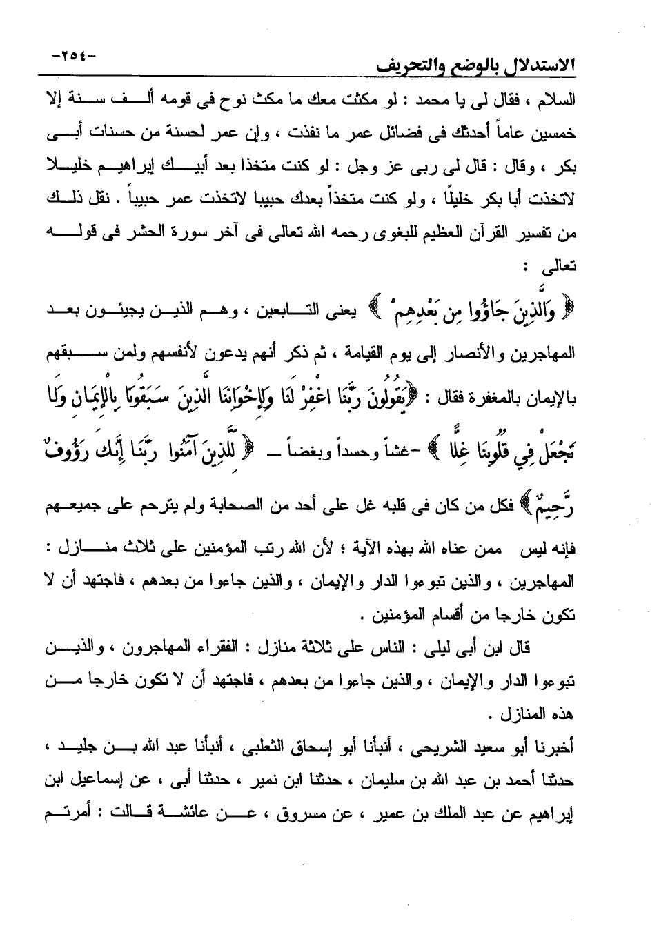 " وَالَّذِينَ جَاؤُوا مِن بَعْدِهِمْ " يعنى التابعين، وهم الذين يجيئون بعد المهاجرين والأنصار إلى يوم القيامة، ثم ذكر أنهم يدعون لأنفسهم ولمن سبقهم بالإيمان بالمغفرة فقال: "يَقُولُونَ رَبَّنَا اغْفِرْ لَنَا وَلِإِخْوَانِنَا الَّذِينَ سَبَقُونَا بِالْإِيمَانِ وَلَا تَجْعَلْ فِي قُلُوبِنَا غِلًّا " -غشاً وحسداً وبغضاً ـ " لِّلَّذِينَ آمَنُوا رَبَّنَا إِنَّكَ رَؤُوفٌ رَّحِيمٌ " فكل من كان في قلبه غل على أحد من الصحابة ولم يترحم على جميعهم فإنه ليس ممن عناه الله بهذه الآية؛ لأن الله رتب المؤمنين على ثلاث منازل: ... المهاجرين، والذين تبوءوا الدار والإيمان، والذين جاءوا من بعدهم، فاجتهد أن لا تكون خارجا من أقسام المؤمنين.
