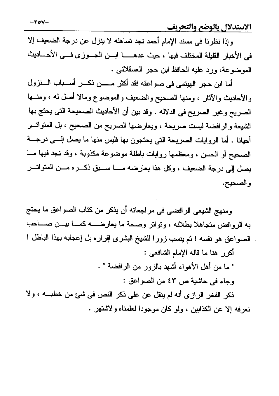 أما ابن حجر الهيتمى في صواعقه فقد أكثر من ذكر أسباب النزول والأحاديث والآثار، ومنها الصحيح والضعيف والموضوع ومالا أصل له، ومنها الصريح وغير الصريح في الدلاله. وقد بين أن الأحاديث الصحيحة التي يحتج بها الشيعة والرافضة ليست صريحة، ويعارضها الصريح من الصحيح، بل المتواتر أحيانا. أما الروايات الصريحة التي يحتجون بها فليس منها ما يصل إلى درجة الصحيح أو الحسن، ومعظمها روايات باطلة موضوعة مكذوبة، وقد نجد فيها ما يصل إلى درجة الضعيف، وكل هذا يعارضه ما سبق ذكره من المتواتر والصحيح.