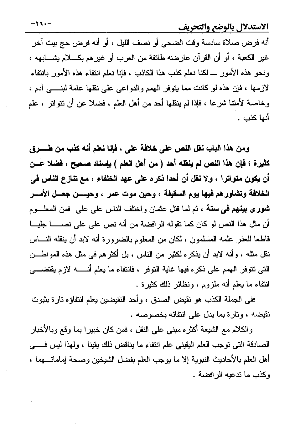 ومن هذا الباب نقل النص على خلافة علىّ، فإنّا نعلم أنه كذب من طرق كثيرة؛ فإن هذا النص لم ينقله أحد (من أهل العلم) بإسناد صحيح، فضلا عن أن يكون متواترا، ولا نقل أن أحدا ذكره على عهد الخلفاء، مع تنازع الناس في الخلافة وتشاورهم فيها يوم السقيفة، وحين موت عمر، وحين جعل الأمر شورى بينهم في ستة، ثم لما قتل عثمان واختلف الناس على على فمن المعلوم أن مثل هذا النص لو كان كما تقوله الرافضة من أنه نص على على نصا جليا قاطعا للعذر علمه المسلمون، لكان من المعلوم بالضرورة أنه لابد أن ينقله الناس نقل مثله، وأنه لابد أن يذكره لكثير من الناس، بل أكثرهم في مثل هذه المواطن التي تتوفر الهمم على ذكره فيها غاية التوفر، فانتفاء ما يعلم أنه لازم يقتضى انتفاء ما يعلم أنه ملزوم، ونظائر ذلك كثيرة.