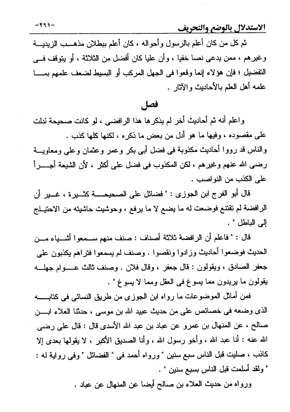 فمن أماثل الموضوعات ما رواه ابن الجوزي من طريق النسائي في كتابه الذي وضعه في خصائص على من حديث عبيد الله بن موسى، حدثنا العلاء ابن صالح، عن المنهال بن عمرو عن عباد بن عبد الله الأسدي قال: قال علىّ رضي الله عنه: أنا عبد الله، وأخو رسول الله، وأنا الصديقِّ الأكبر، لا يقولها بعدى إلا كاذب، صليت قبل الناس سبع سنين " ورواه أحمد في " الفضائل " وفى رواية له: " ولقد أسلمت قبل الناس بسبع سنين ".