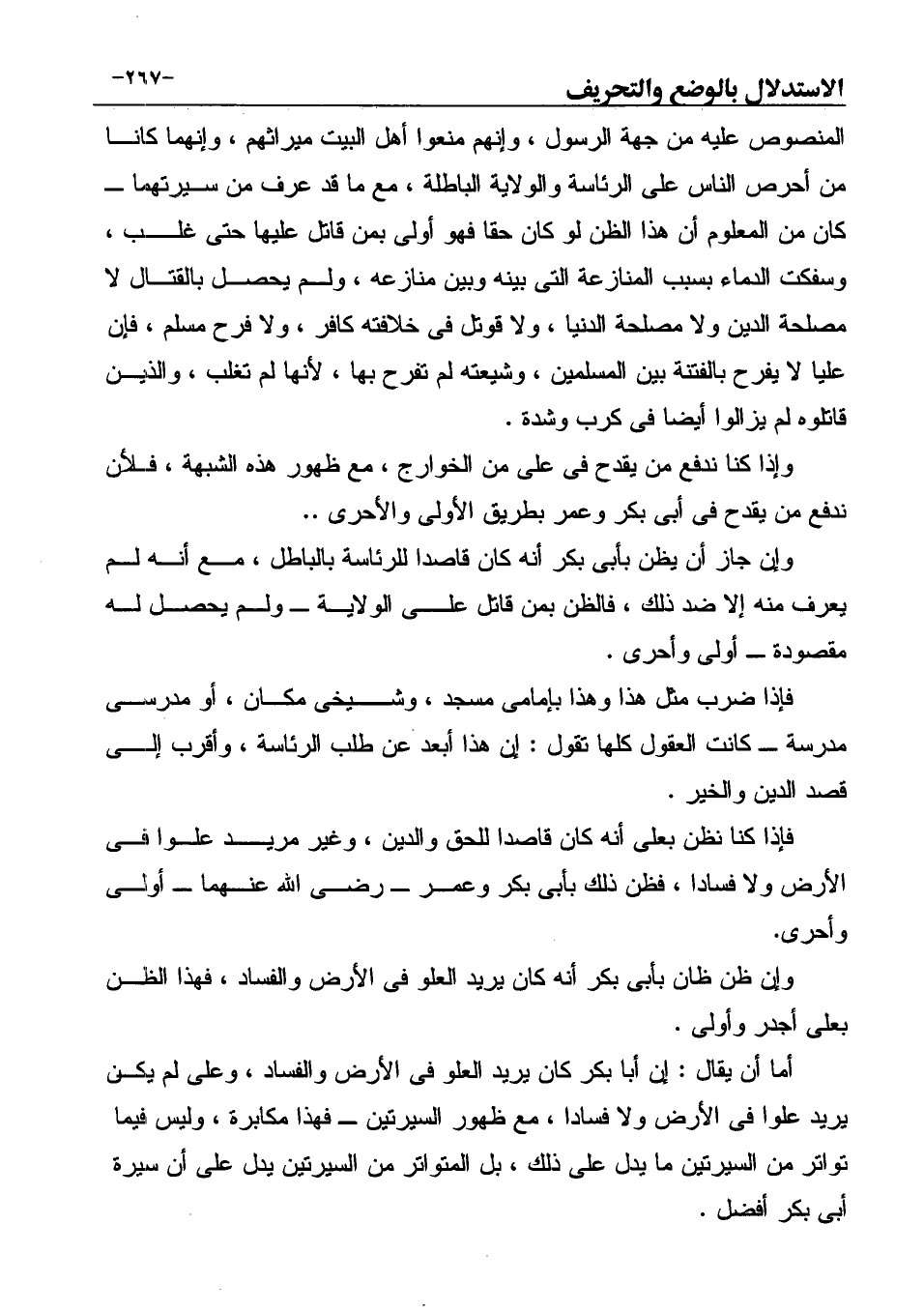 فإذا كنا نظن بعلىّ أنه كان قاصدا للحق والدين، وغير مريد علواً في الأرض ولا فسادا، فظنُّ ذلك بأبى بكر وعمر ـ رضي الله عنهما ـ أولى وأحرى.
