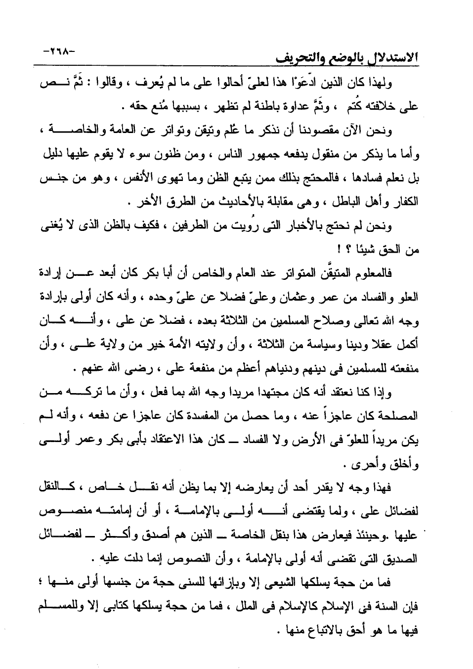 فما من حجة يسلكها الشيعي إلا وبإزائها للسنى حجة من جنسها أولى منها؛ فإن السنة في الإسلام كالإسلام في الملل، فما من حجة يسلكها كتابى إلا وللمسلم فيها ما هو أحق بالاتباع منها.