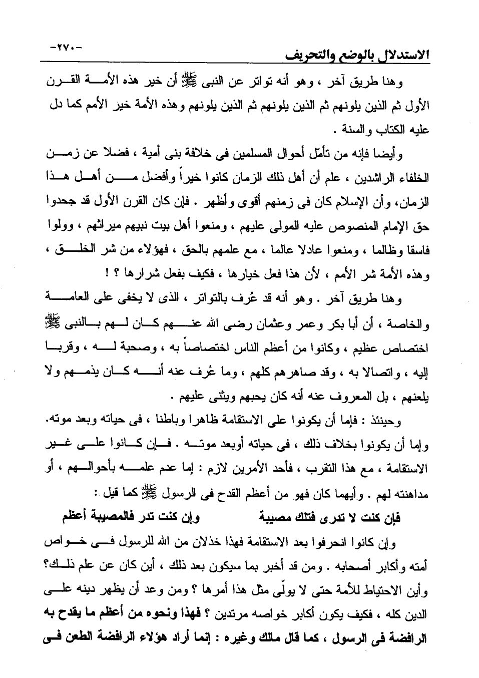 وأيضا فإنه من تأمّل أحوال المسلمين في خلافة بنى أمية، فضلا عن زمن الخلفاء الراشدين، علم أن أهل ذلك الزمان كانوا خيراً وأفضل من أهل هذا الزمان، وأن الإسلام كان في زمنهم أقوى وأظهر. فإن كان القرن الأول قد جحدوا حق الإمام المنصوص عليه المولى عليهم، ومنعوا أهل بيت نبيهم ميراثهم، وولوا فاسقا وظالما، ومنعوا عادلا عالما، مع علمهم بالحق، فهؤلاء من شر الخلق، وهذه الأمة شر الأمم، لأن هذا فعل خيارها، فكيف بفعل شرارها؟ !