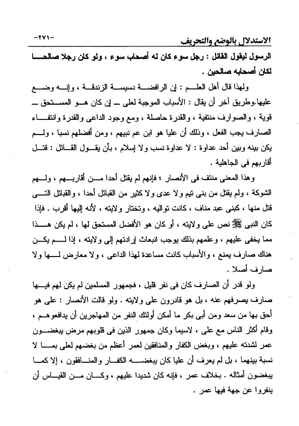 ولو قُدِّر أن الصارف كان في نفر قليل، فجمهور المسلمين لم يكن لهم فيها صارف يصرفهم عنه، بل هو قادرون على ولايته. ولو قالت الأنصار: علىُّ هو أحق بها من سعد ومن أبى بكر ما أمكن أولئك النفر من المهاجرين أن يدافعوهم، وقام أكثر الناس مع علىّ، لاسيما وكان جمهور الذين في قلوبهم مرض يبغضون عمر لشدته عليهم، وبغض الكفار والمنافقين لعمر أعظم من بغضهم لعلى بما لا نسبة بينهما، بل لم يعرف أن علياً كان يبغضه الكفّار والمنافقون، إلا كما يبغضون أمثاله. بخلاف عمر، فإنه كان شديدا عليهم، وكان من القياس أن ينفروا عن جهة فيها عمر.