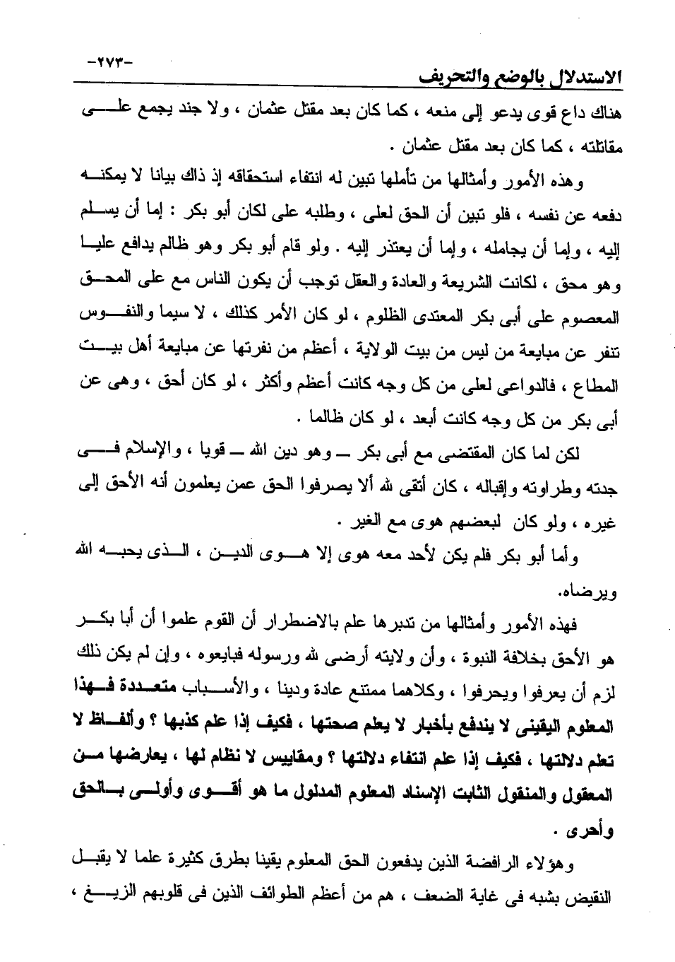 فهذه الأمور وأمثالها من تدبرها علم بالاضطرار أن القوم علموا أن أبا بكر هو الأحق بخلافة النبوة، وأن ولايته أرضى لله ورسوله فبايعوه، وإن لم يكن ذلك لزم أن يعرفوا ويحرفوا، وكلاهما ممتنع عادة ودينا، والأسباب متعددة فهذا المعلوم اليقينى لا يندفع بأخبار لا يُعلم صحتها، فكيف إذا علم كذبها؟ وألفاظ لا تعلم دلالتها، فكيف إذا علم انتفاء دلالتها؟ ومقاييس لا نظام لها، يعارضها من المعقول والمنقول الثابت الإسناد المعلوم المدلول ما هو أقوى وأولى بالحق وأحرى.