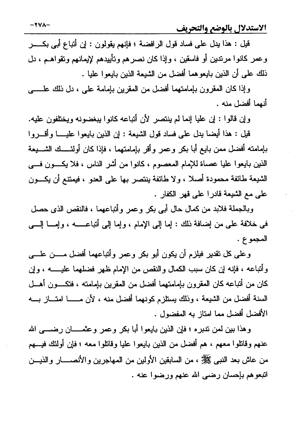 وعلى كل تقدير فيلزم أن يكون أبو بكر وعمر وأتباعهما أفضل من علىّ وأتباعه، فإنه إن كان سبب الكمال والنقص من الإمام ظهر فضلهما عليه، وإن كان من أتباعه كان المقرون بإمامتهما أفضل من المقرين بإمامته، فتكون أهل السنة أفضل من الشيعة، وذلك يستلزم كونهما أفضل منه، لأن ما امتاز به الأفضل أفضل مما امتاز به المفضول.