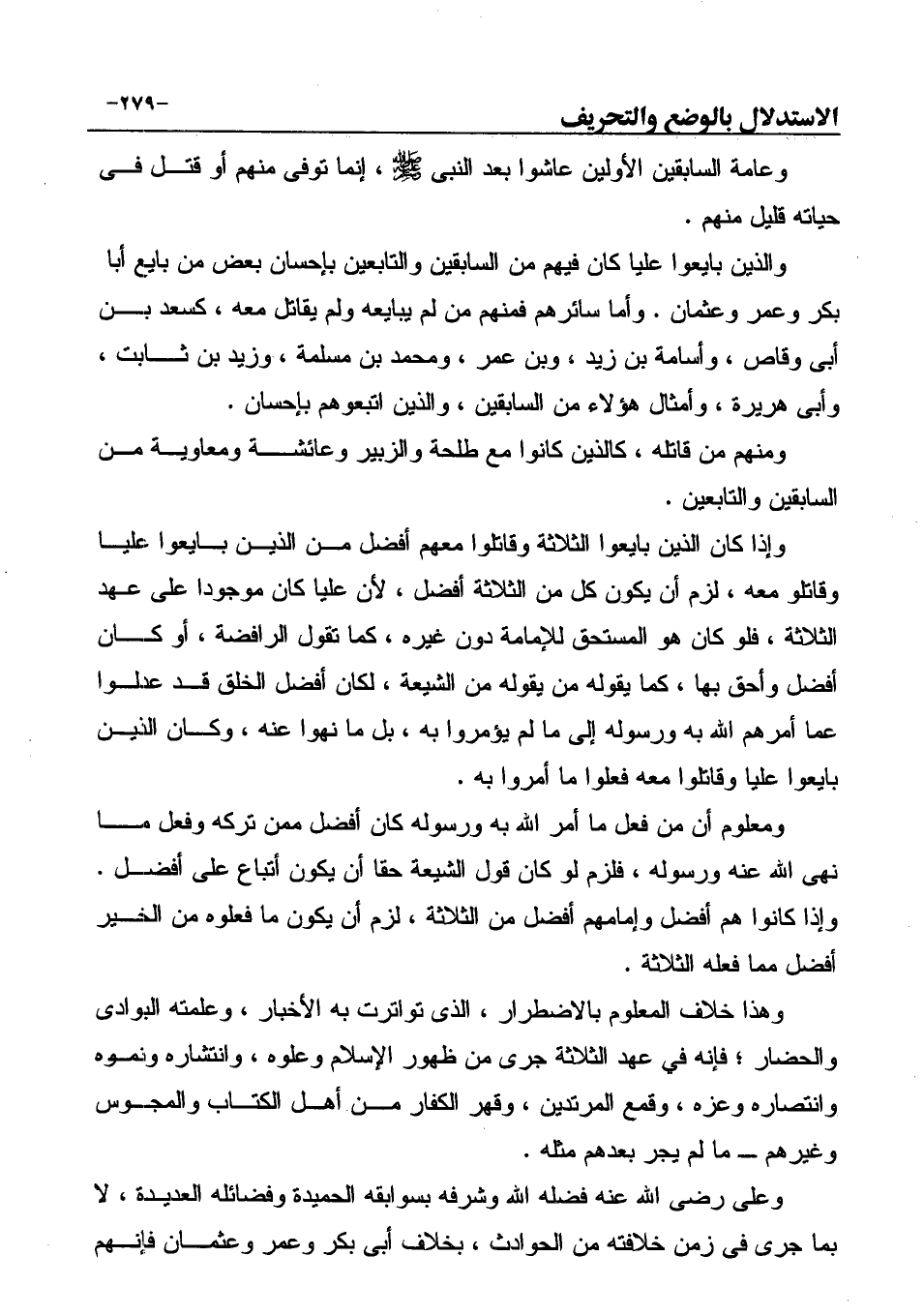 وعلىّ رضي الله عنه فضّله الله وشرّفه بسوابقه الحميدة وفضائله العديدة، لا بما جرى في زمن خلافته من الحوادث، بخلاف أبى بكر وعمر وعثمان فإنهم