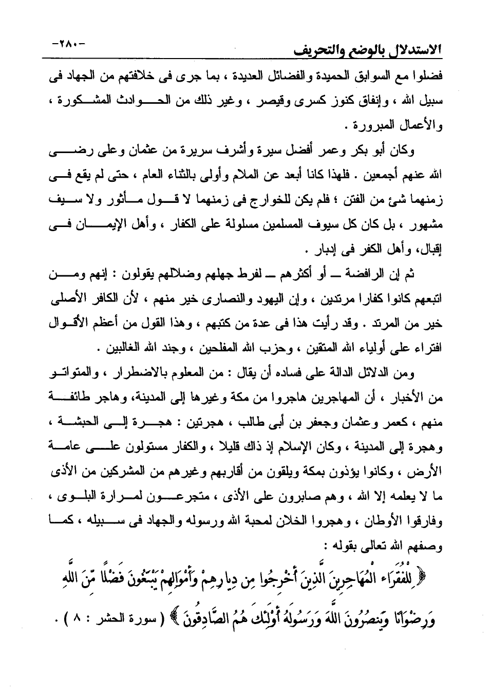 ومن الدلائل الدالة على فساده أن يقال: من المعلوم بالاضطرار، والمتواتر من الأخبار، أن المهاجرين هاجروا من مكة وغيرها إلى المدينة، وهاجر طائفة منهم، كعمر وعثمان وجعفر بن أبى طالب، هجرتين: هجرة إلى الحبشة، وهجرة إلى المدينة، وكان الإسلام إذ ذاك قليلا، والكفار مستولون على عامة الأرض، وكانوا يؤذون بمكة ويلقون من أقاربهم وغيرهم من المشركين من الأذى ما لا يعلمه إلا الله، وهم صابرون على الأذى، متجرعون لمرارة البلوى، وفارقوا الأوطان، وهجروا الخلان لمحبة الله ورسوله والجهاد في سبيله، كما وصفهم الله تعالى بقوله:
