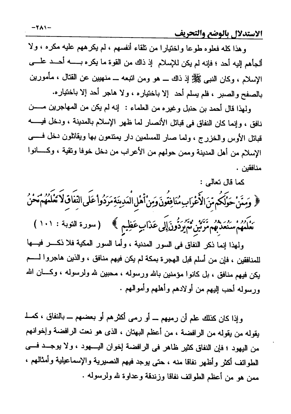 ولهذا قال أحمد بن حنبل وغيره من العلماء: إنه لم يكن من المهاجرين من نافق، وإنما كان النفاق في قبائل الأنصار لما ظهر الإسلام بالمدينة، ودخل فيه قبائل الأوس والخزرج، ولما صار للمسلمين دار يمتنعون بها ويقاتلون دخل في الإسلام من أهل المدينة وممن حولهم من الأعراب من دخل خوفا وتقية، وكانوا منافقين.