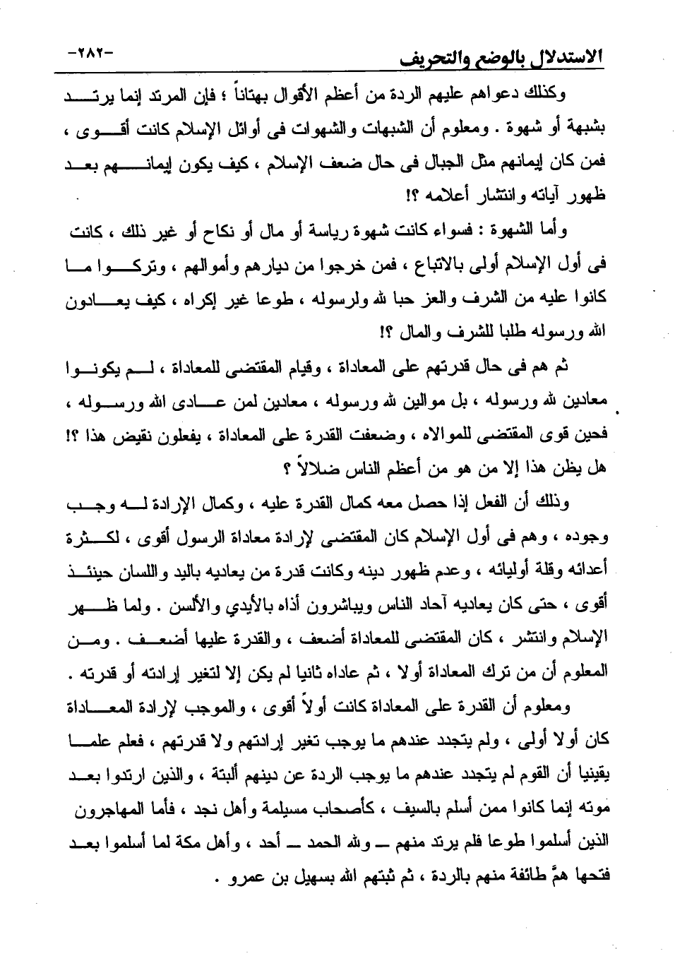 ومعلوم أن القدرة على المعاداة كانت أولاً أقوى، والموجب لإرادة المعاداة كان أولا أولى، ولم يتجدد عندهم ما يوجب تغير إرادتهم ولا قدرتهم، فعلم علما يقينيا أن القوم لم يتجدد عندهم ما يوجب الردة عن دينهم ألبتة، والذين ارتدوا بعد موته إنما كانوا ممن أسلم بالسيف، كأصحاب مسيلمة وأهل نجد، فأما المهاجرون الذين أسلموا طوعا فلم يرتد منهم ـ ولله الحمد ـ أحد، وأهل مكة لما أسلموا بعد فتحها همَّ طائفة منهم بالردة، ثم ثبتهم الله بسهيل بن عمرو.