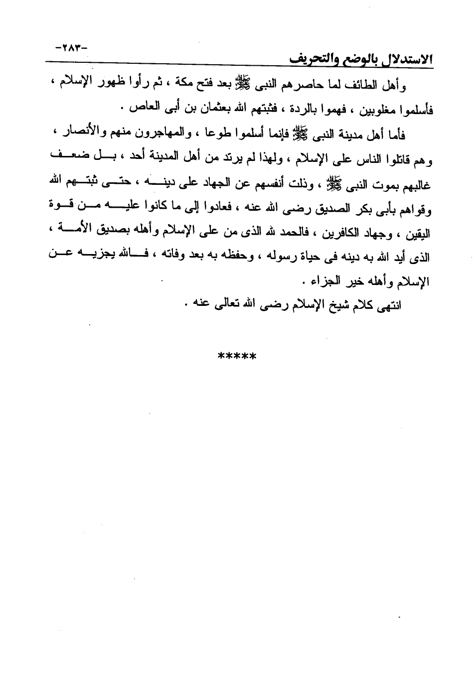 فأما أهل مدينة النبي صَلَّى اللهُ عَلَيْهِ وَسَلَّمَ فإنما أسلموا طوعا، والمهاجرون منهم والأنصار، وهم قاتلوا الناس على الإسلام، ولهذا لم يرتد من أهل المدينة أحد، بل ضعف غالبهم بموت النبي صَلَّى اللهُ عَلَيْهِ وَسَلَّمَ، وذلت أنفسهم عن الجهاد على دينه، حتى ثبتهم الله وقواهم بأبى بكر الصديق رضي الله عنه، فعادوا إلى ما كانوا عليه من قوة اليقين، وجهاد الكافرين، فالحمد لله الذي من على الإسلام وأهله بصديق الأمة، الذي أيد الله به دينه في حياة رسوله، وحفظه به بعد وفاته، فالله يجزيه عن الإسلام وأهله خير الجزاء. انتهى كلام شيخ الإسلام رضي الله تعالى عنه.