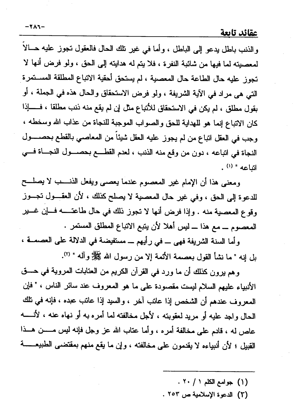 ومعنى هذا أن الإمام غير المعصوم عندما يعصى ويفعل الذنب لا يصلح للدعوة إلى الحق، وفي غير حال المعصية لا يصلح كذلك، لأن العقول تجوز وقوع المعصية منه. وإذا فرض أنها لا تجوز ذلك في حال طاعته فإن غير المعصوم ـ مع هذا ـ ليس أهلا لأن يتبع الاتباع المطلق المستمر.