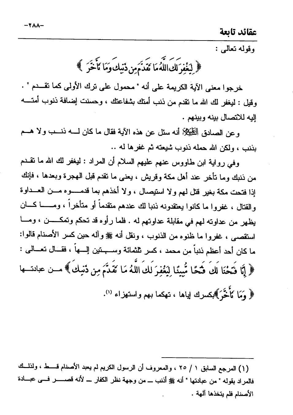 (¬1) المرجع السابق 1 / 25، والمعروف أن الرسول الكريم لم يعبد الأصنام قط، ولذلك فالمراد بقوله " من عبادتها " أنه - صَلَّى اللهُ عَلَيْهِ وَسَلَّمَ - أذنب ـ من وجهة نظر الكفار ـ لأنه قصر في عبادة الأصنام فلم يتخذها آلهة.