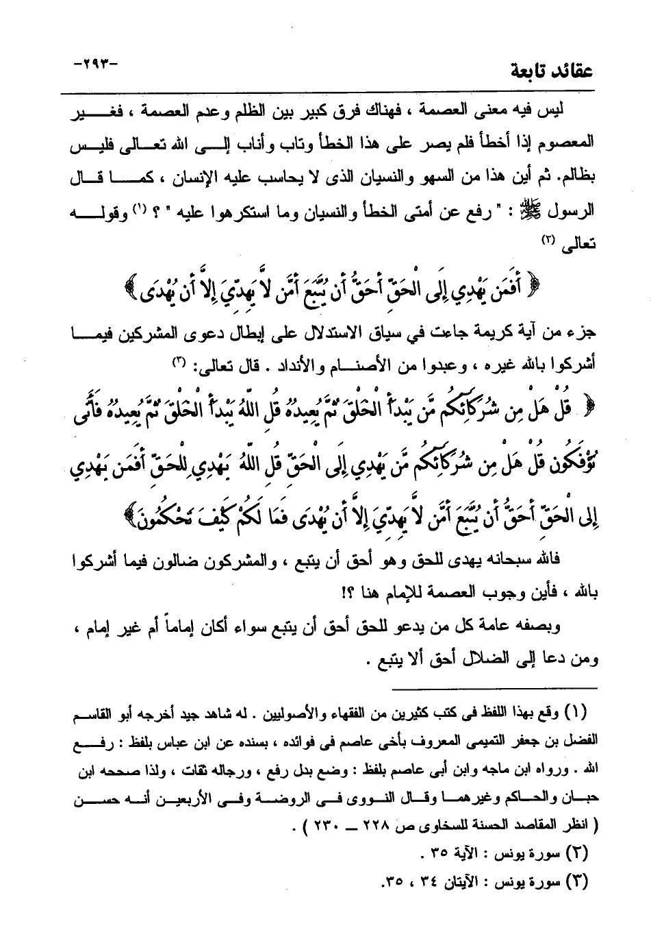 ليس فيه معنى العصمة، فهناك فرق كبير بين الظلم وعدم العصمة، فغير المعصوم إذا أخطأ فلم يصر على هذا الخطأ وتاب وأناب إلى الله تعالى فليس بظالم. ثم أين هذا من السهو والنسيان الذي لا يحاسب عليه الإنسان، كما قال الرسول صَلَّى اللهُ عَلَيْهِ وَسَلَّمَ: " رفع عن أمتى الخطأ والنسيان وما استكرهوا عليه "؟ (¬1) وقوله تعالى (¬2) " أَفَمَن يَهْدِي إِلَى الْحَقِّ أَحَقُّ أَن يُتَّبَعَ أَمَّن لاَّ يَهِدِّيَ إِلاَّ أَن يُهْدَى "