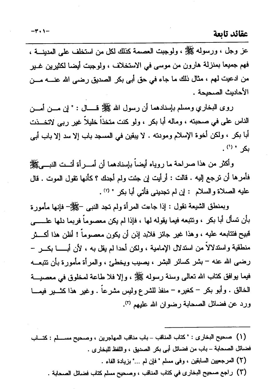 عز وجل، ورسوله صَلَّى اللهُ عَلَيْهِ وَسَلَّمَ، ولوجبت العصمة كذلك لكل من استخلف على المدينة، فهم جميعا بمنزلة هارون من موسى في الاستخلاف، ولوجبت أيضا لكثيرين غير من ادعيت لهم، مثال ذلك ما جاء في حق أبى بكر الصديق رضي الله عنه من الأحاديث الصحيحة.