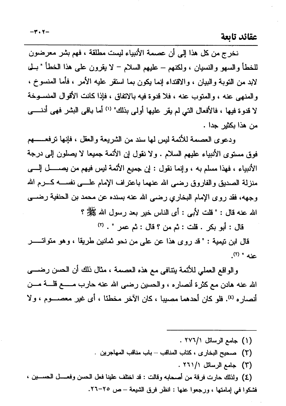 ودعوى العصمة للأئمة ليس لها سند من الشريعة والعقل، فإنها ترفعهم فوق مستوى الأنبياء عليهم السلام. ولا نقول إن الأئمة جميعاً لا يصلون إلى درجة الأنبياء، فهذا مسلم به، وإنما نقول: إن جميع الأئمة ليس فيهم من يصل إلى منزلة الصديق والفاروق رضي الله عنهما باعتراف الإمام على نفسه كرم الله وجهه، فقد روى الإمام البخاري رضي الله عنه بسنده عن محمد بن الحنفية رضي الله عنه قال: " قلت لأبى: أي الناس خير بعد رسول الله صَلَّى اللهُ عَلَيْهِ وَسَلَّمَ؟