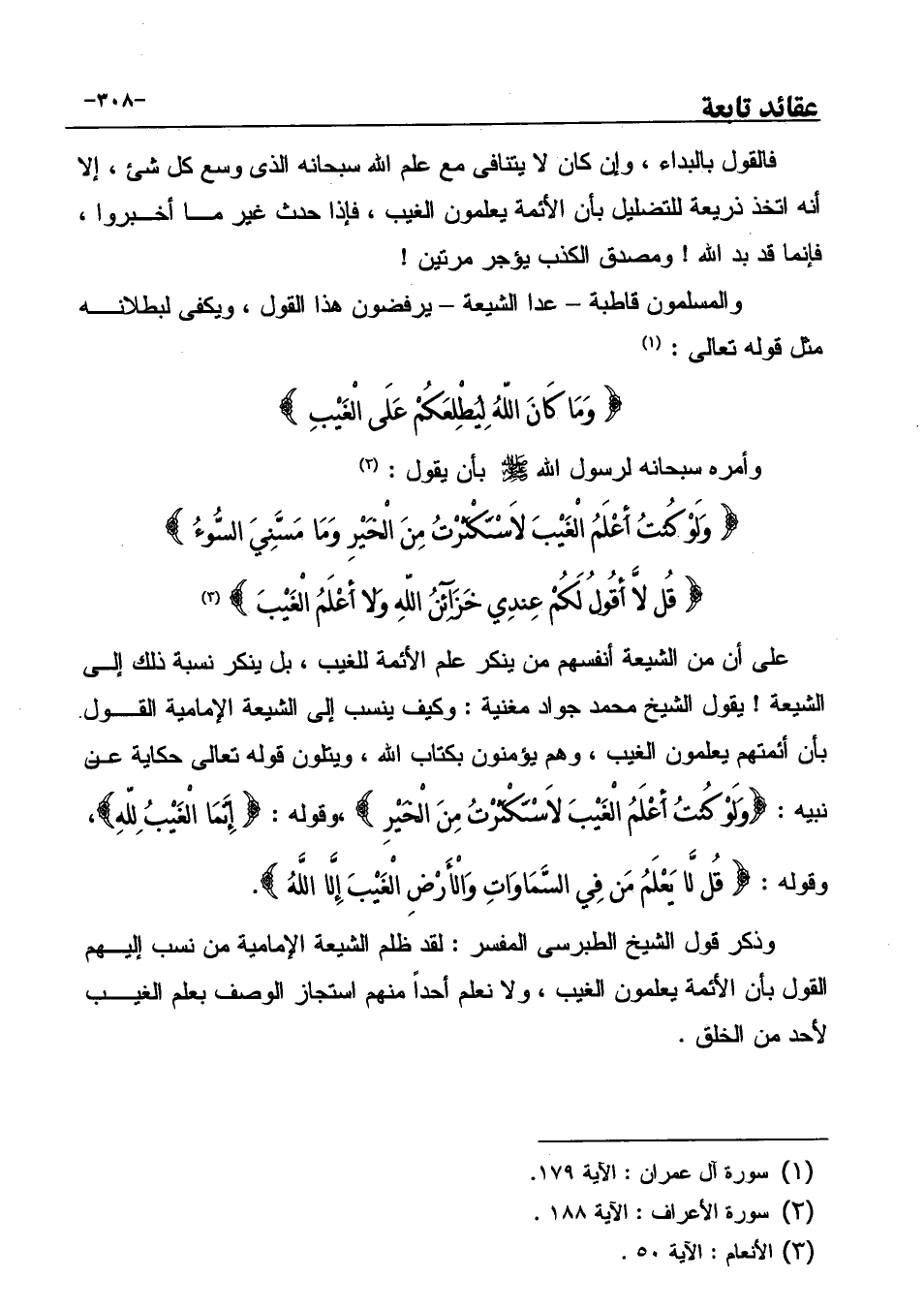 وذكر قول الشيخ الطبرسي المفسر: لقد ظلم الشيعة الإمامية من نسب إليهم القول بأن الأئمة يعلمون الغيب، ولا نعلم أحداً منهم استجاز الوصف بعلم الغيب لأحد من الخلق.