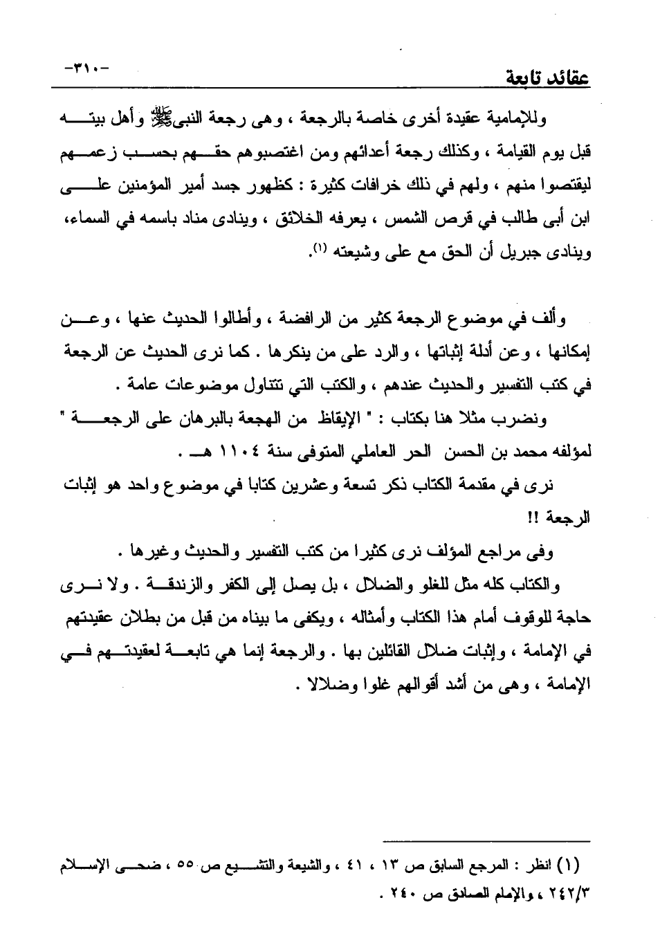 والكتاب كله مثل للغلو والضلال، بل يصل إلى الكفر والزندقة. ولا نرى حاجة للوقوف أمام هذا الكتاب وأمثاله، ويكفى ما بيناه من قبل من بطلان عقيدتهم في الإمامة، وإثبات ضلال القائلين بها. والرجعة إنما هي تابعة لعقيدتهم في الإمامة، وهى من أشد أقوالهم غلواً وضلالاً.