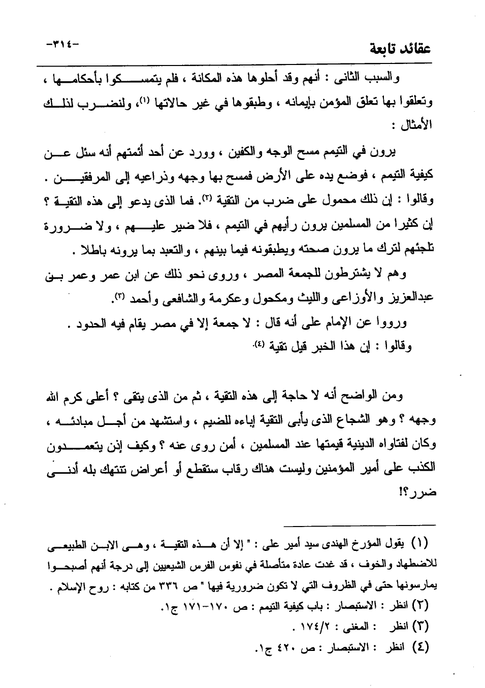 (¬1) يقول المؤرخ الهندى سيد أمير على: " إلا أن هذه التقية، وهى الابن الطبيعى للاضطهاد والخوف، قد غدت عادة متأصلة في نفوس الفرس الشيعيين إلى درجة أنهم أصبحوا يمارسونها حتى في الظروف التي لا تكون ضرورية فيها " ص 336 من كتابه: روح الإسلام.