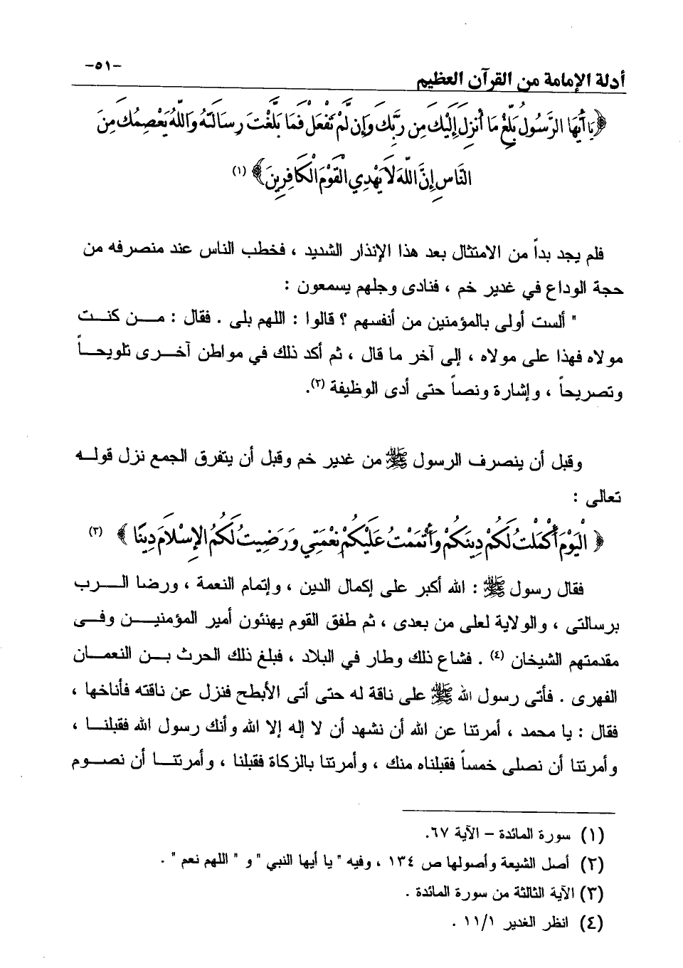 يَا أَيُّهَا الرَّسُولُ بَلِّغْ مَا أُنزِلَ إِلَيْكَ مِن رَّبِّكَ وَإِن لَّمْ تَفْعَلْ فَمَا بَلَّغْتَ رِسَالَتَهُ وَاللهُ يَعْصِمُكَ مِنَ النَّاسِ إِنَّ اللهَ لاَ يَهْدِي الْقَوْمَ الْكَافِرِينَ" (¬1)