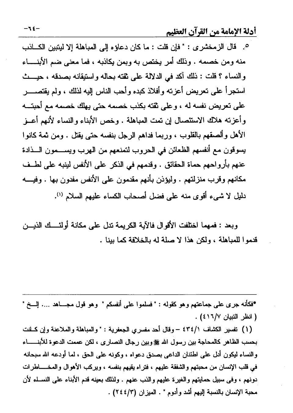 (¬1) تفسير الكشاف 1/434 - وقال أحد مفسري الجعفرية: " والمباهلة والملاعنة وإن كانت بحسب الظاهر كالمحاجة بين رسول الله - صَلَّى اللهُ عَلَيْهِ وَسَلَّمَ - وبين رجال النصارى، لكن عممت الدعوة للأبناء والنساء ليكون أدل على اطئنان الداعى بصدق دعواه، وكونه على الحق، لما أودعه الله سبحانه في قلب الإنسان من محبتهم والشفقة عليهم، فتراه يقيهم بنفسه، ويركب الأهوال والمخاطرات دونهم، وفى سبيل حمايتهم والغيرة عليهم والذب عنهم. ولذلك بعينه قدم الأبناء على النساء لأن محبة الإنسان بالنسبة إليهم أشد وأدوم ". الميزان (3/244) .