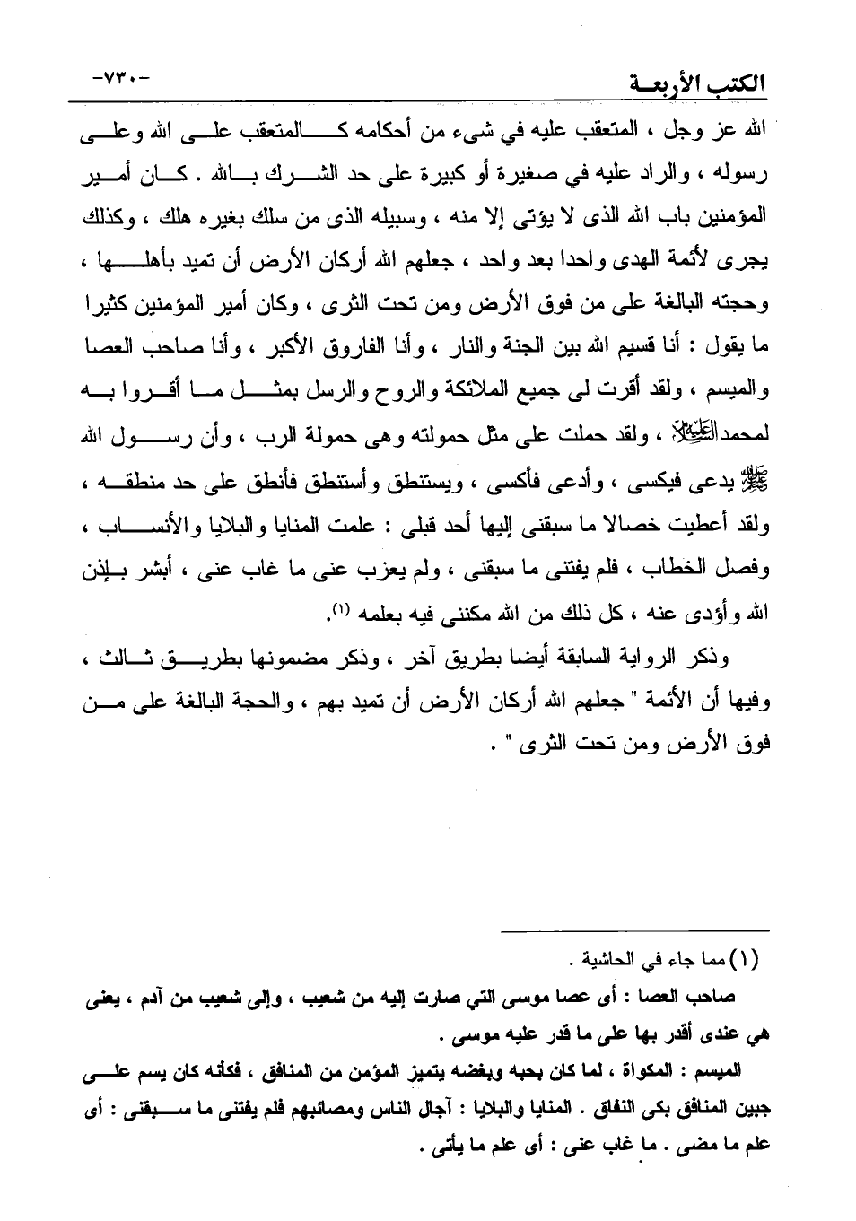 الله عز وجل، المتعقب عليه في شىء من أحكامه كالمتعقب على الله وعلى رسوله، والراد عليه في صغيرة أو كبيرة على حد الشرك بالله. كان أمير المؤمنين باب الله الذى لا يؤتى إلا منه، وسبيله الذى من سلك بغيره هلك، وكذلك يجرى لأئمة الهدى واحداً بعد واحد، جعلهم الله أركان الأرض أن تميد بأهلها، وحجته البالغة على من فوق الأرض ومن تحت الثرى، وكان أمير المؤمنين كثيراً ما يقول: أنا قسيم الله بين الجنة والنار، وأنا الفاروق الأكبر، وأنا صاحب العصا والميسم، ولقد أقرت لى جميع الملائكة والروح والرسل بمثل ما أقروا به لمحمدرضي الله عنه، ولقد حملت على مثل حمولته وهى حمولة الرب، وأن رسول الله صَلَّى اللهُ عَلَيْهِ وَسَلَّمَ يدعى فيكسى، وأدعى فأكسى، ويستنطق وأستنطق فأنطق على حد منطقه، ولقد أعطيت خصالاً ما سبقنى إليها أحد قبلى: علمت المنايا والبلايا والأنساب، وفصل الخطاب، فلم يفتنى ما سبقنى، ولم يعزب عنى ما غاب عنى، أبشر بإذن الله وأؤدى عنه، كل ذلك من الله مكننى فيه بعلمه (¬1) .