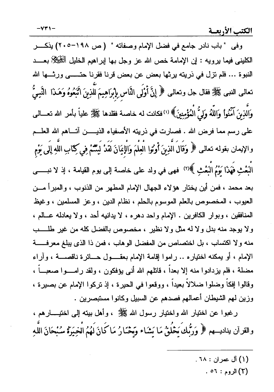 وفى " باب نادر جامع في فضل الإمام وصفاته " (ص 198-205) يذكر الكلينى فيما يرويه: إن الإمامة خص الله عز وجل بها إبراهيم الخليل رضي الله عنه بعد النبوة ... فلم تزل في ذريته يرثها بعض عن بعض قرنا فقرنا حتى ورثها الله تعالى النبى صَلَّى اللهُ عَلَيْهِ وَسَلَّمَ فقال جل وتعالى] إِنَّ أَوْلَى النَّاسِ بِإِبْرَاهِيمَ لَلَّذِينَ اتَّبَعُوهُ وَهَذَا النَّبِيُّ وَالَّذِينَ آمَنُواْ وَاللهُ وَلِيُّ الْمُؤْمِنِينَ [ (¬1) فكانت له خاصة فقلدها صَلَّى اللهُ عَلَيْهِ وَسَلَّمَ علياً بأمر الله تعالى على رسم مما فرض الله. فصارت في ذريته الأصفياء الذين آتاهم الله العلم والإيمان بقوله تعالى] وَقَالَ الَّذِينَ أُوتُوا الْعِلْمَ وَالْإِيمَانَ لَقَدْ لَبِثْتُمْ فِي كِتَابِ اللَّهِ إِلَى يَوْمِ الْبَعْثِ فَهَذَا يَوْمُ الْبَعْثِ [ (¬2) فهى في ولد على خاصة إلى يوم القيامة، إذ لا نبى بعد محمد، فمن أين يختار هؤلاء الجهال الإمام المطهر من الذنوب، والمبرأ من العيوب، المخصوص بالعلم الموسوم بالحلم، نظام الدين، وعز المسلمين، وغيظ المنافقين، وبوار الكافرين. الإمام واحد دهره، لا يدانيه أحد، ولا يعادله عالم، ولا يوجد منه بدل ولا له مثل ولا نظير، مخصوص بالفضل كله من غير طلب منه ولا اكتساب، بل اختصاص من المفضل الوهاب، فمن ذا الذى يبلغ معرفة الإمام، أو يمكنه اختياره.. راموا إقامة الإمام بعقول حائرة ناقصة، وآراء مضلة، فلم يزدادوا منه إلا بعداً، قاتلهم الله أنى يؤفكون، ولقد راموا صعباً، وقالوا إفكاً وضلوا ضلالاً بعيداً، ووقعوا في الحيرة، إذ تركوا الإمام عن بصيرة، وزين لهم الشيطان أعمالهم فصدهم عن السبيل وكانوا مستبصرين.