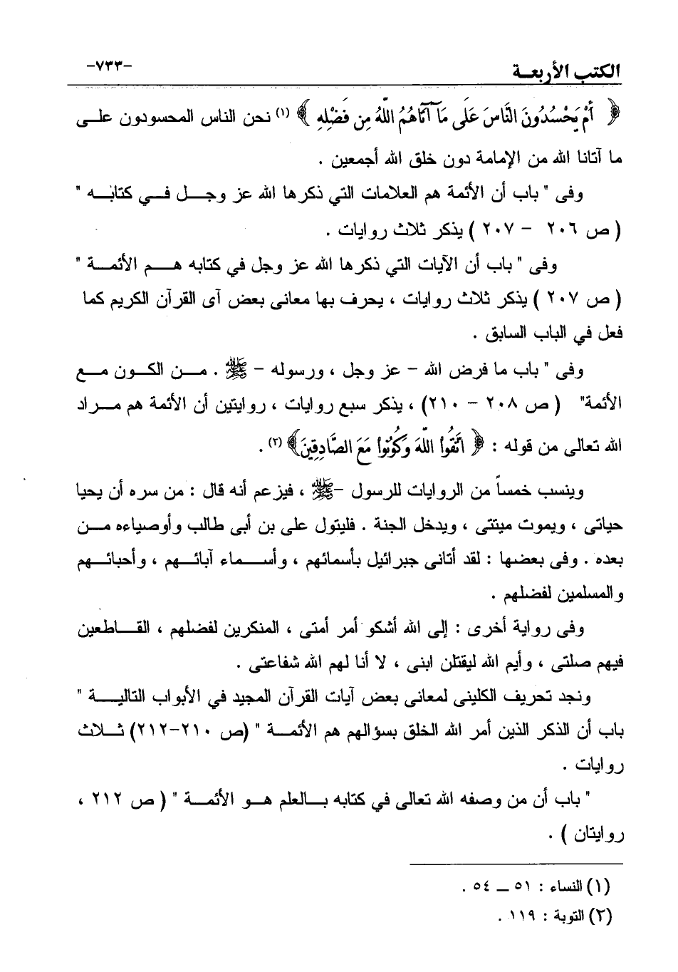 وفى " باب أن الآيات التي ذكرها الله عز وجل في كتابه هم الأئمة " (ص 207) يذكر ثلاث روايات، يحرف بها معانى بعض آى القرآن الكريم كما فعل في الباب السابق.