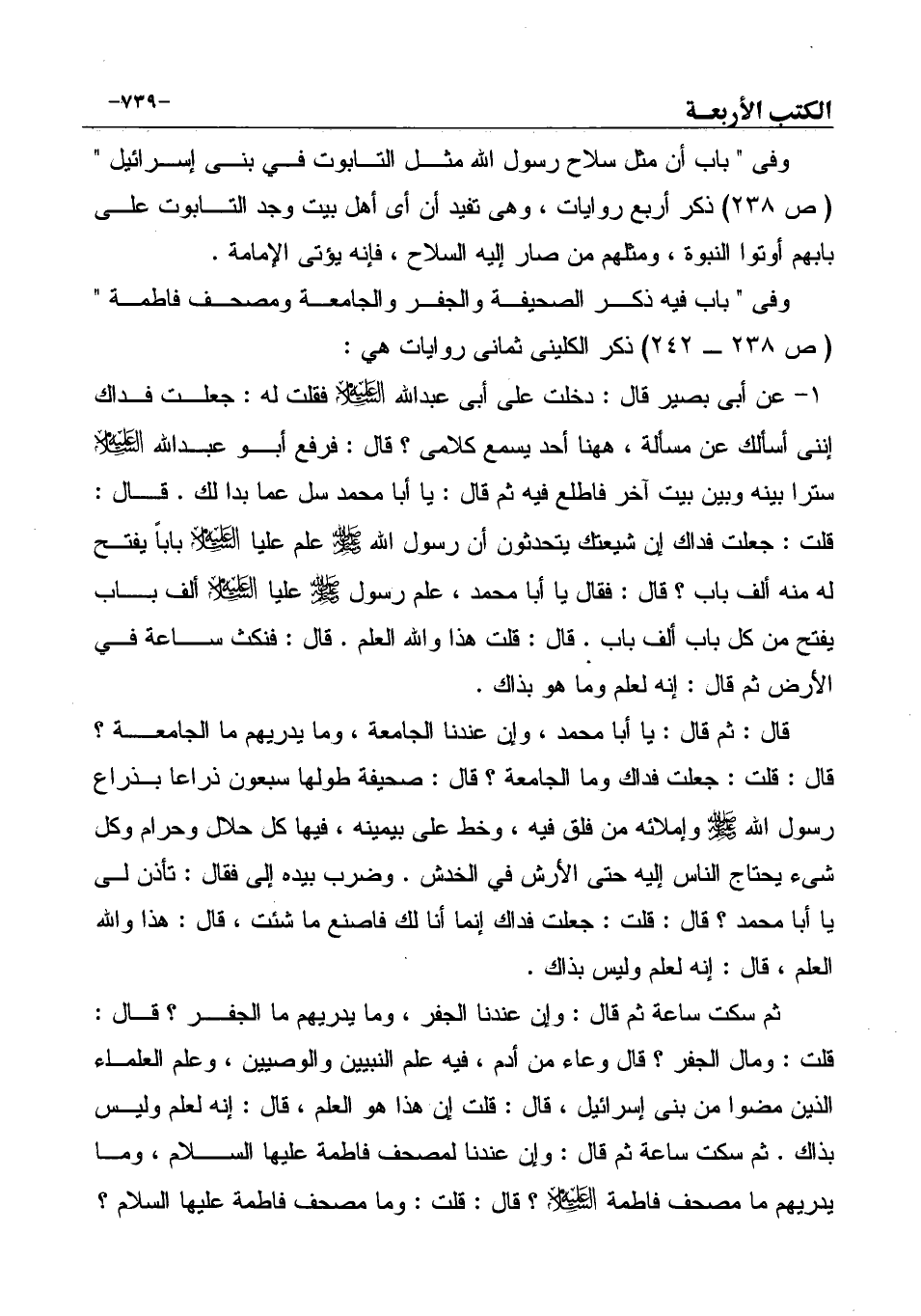 وفى " باب فيه ذكر الصحيفة والجفر والجامعة ومصحف فاطمة " (ص 238 ـ 242) ذكر الكلينى ثمانى روايات هي: