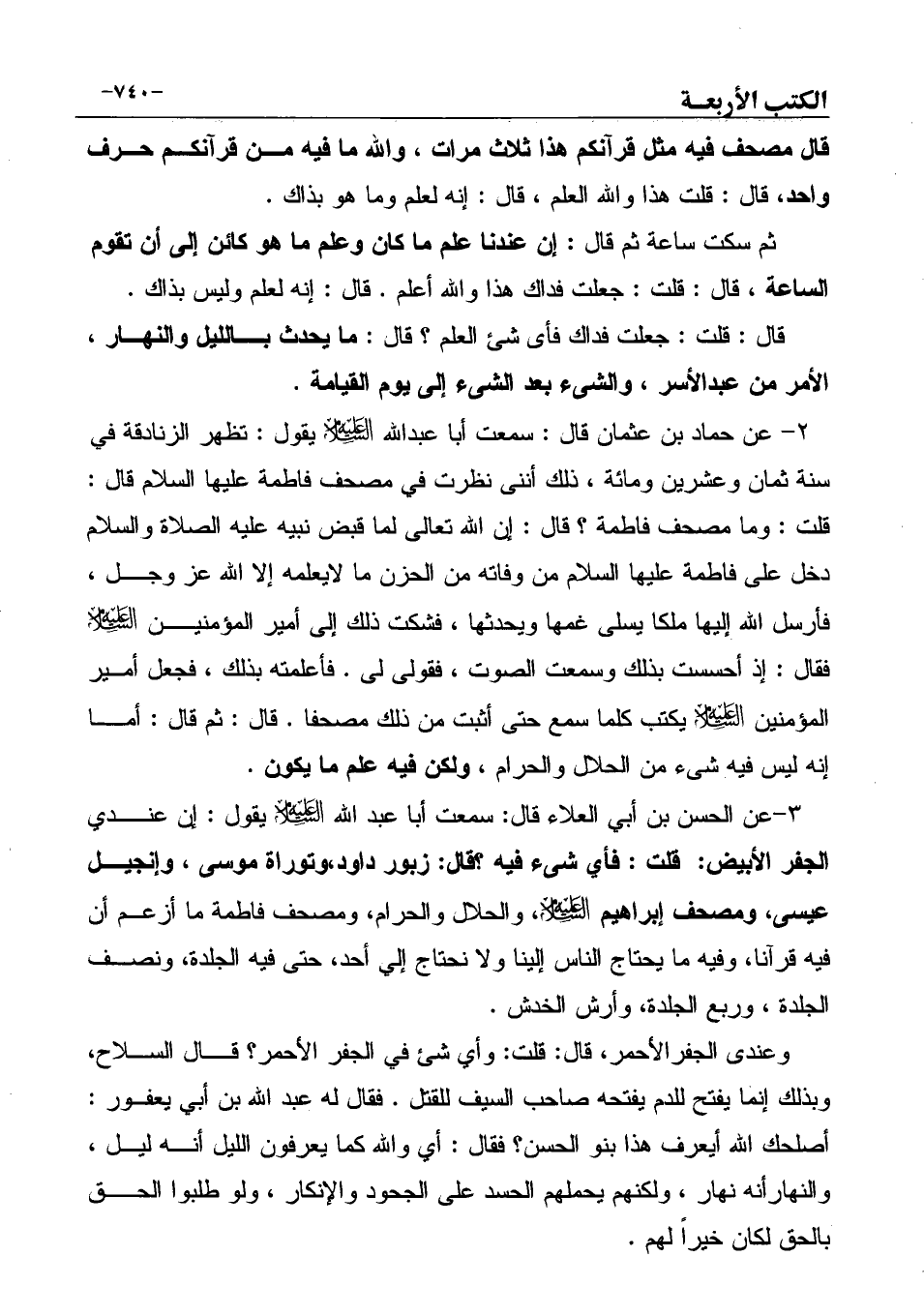2- عن حماد بن عثمان قال: سمعت أبا عبد الله رضي الله عنه يقول: تظهر الزنادقة في سنة ثمان وعشرين ومائة، ذلك أننى نظرت في مصحف فاطمة عليها السلام قال: قلت: وما مصحف فاطمة؟ قال: إن الله تعالى لما قبض نبيه عليه الصلاة والسلام دخل على فاطمة عليها السلام من وفاته من الحزن ما لايعلمه إلا الله عز وجل، فأرسل الله إليها ملكا يسلى غمها ويحدثها، فشكت ذلك إلى أمير المؤمنين رضي الله عنه فقال: إذ أحسست بذلك وسمعت الصوت، فقولى لى. فأعلمته بذلك، فجعل أمير المؤمنين رضي الله عنه يكتب كلما سمع حتى أثبت من ذلك مصحفا. قال: ثم قال: أما إنه ليس فيه شىء من الحلال والحرام، ولكن فيه علم ما يكون.