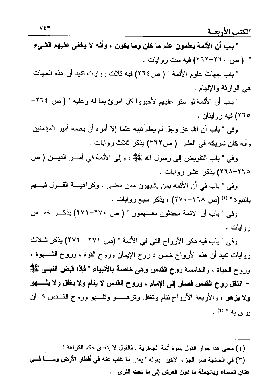 وفى " باب فيه ذكر الأرواح التي في الأئمة " (ص 271- 272) يذكر ثلاث روايات تفيد أن هذه الأرواح خمس: روح الإيمان وروح القوة، وروح الشهوة، وروح الحياة، والخامسة روح القدس وهى خاصة بالأنبياء " فإذا قبض النبى صَلَّى اللهُ عَلَيْهِ وَسَلَّمَ - انتقل روح القدس فصار إلى الإمام، وروح القدس لا ينام ولا يغفل ولا يلهو ولا يزهو، والأربعة الأرواح تنام وتغفل وتزهو وتلهو وروح القدس كان يرى به " (¬2) .
