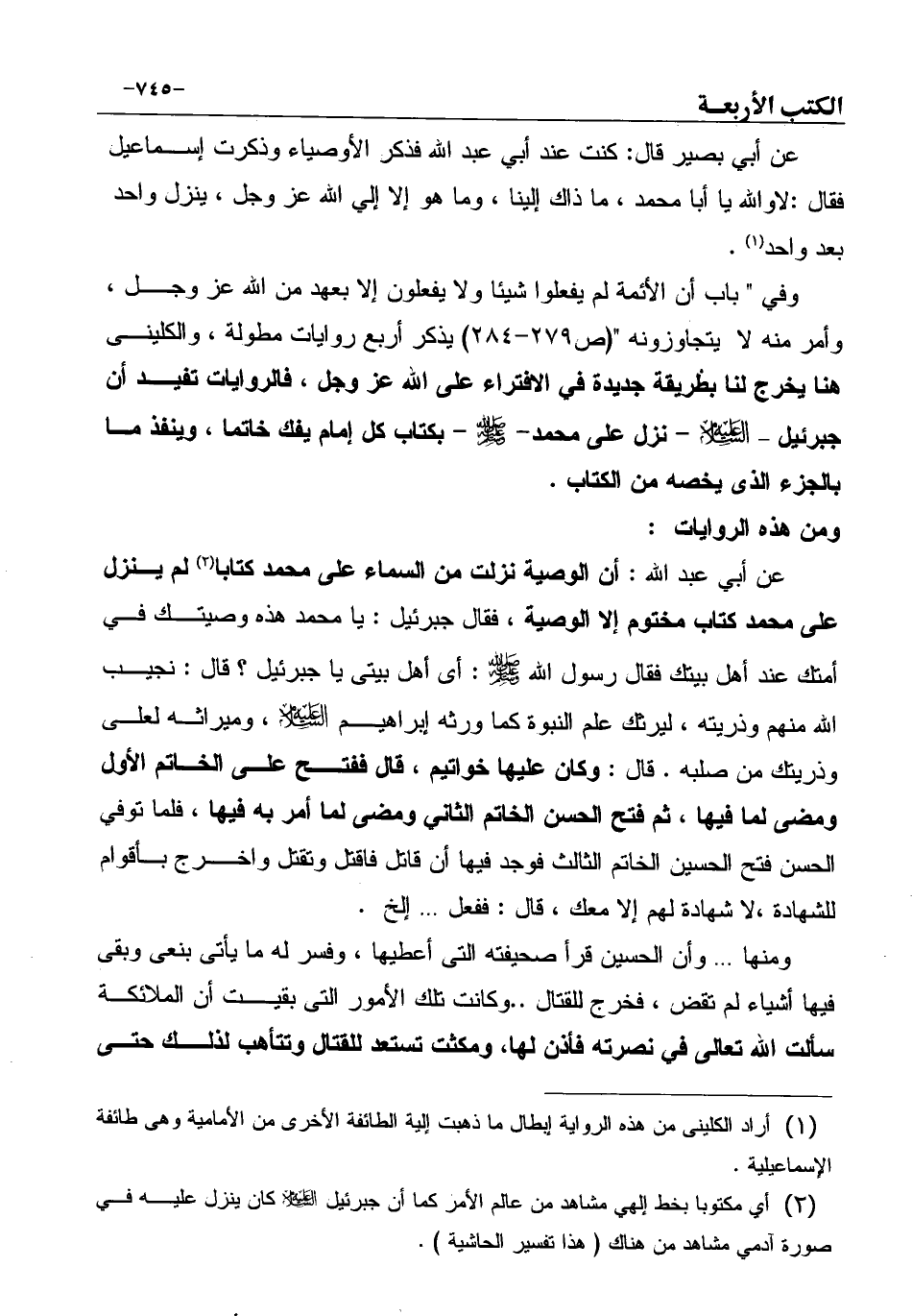 (¬1) أراد الكلينى من هذه الرواية إبطال ما ذهبت إلية الطائفة الأخرى من الأمامية وهى طائفة الإسماعيلية.
