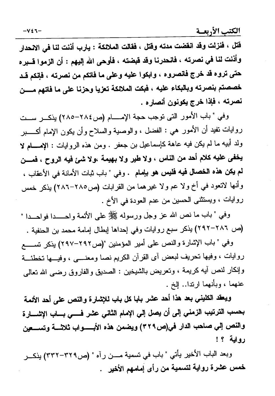 وفي " باب الإشارة والنص على أمير المؤمنين " (ص292-297) يذكر تسع روايات، وفيها تحريف لبعض آى القرآن الكريم نصا ومعنى، وفيها تخطئة وإنكار لنص آيه كريمة، وتعريض بالشيخين: الصديق والفاروق رضى الله تعالى عنهما، وبأنهما ارتدا.. إلخ.