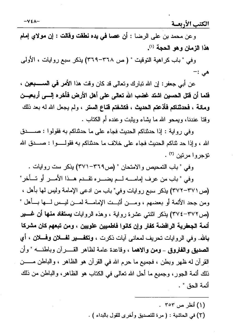 وفي " باب من عرف إمامه لم يضره تقدم هذا الأمر أو تأخر" ... (ص371-372) يذكر سبع روايات وفي" باب من ادعى الإمامة وليس لها بأهل، ومن جحد الأئمة أو بعضهم، ومن أثبت الإمامة لمن ليس لها بأهل " (ص372-374) يذكر اثنتي عشرة رواية، وهذه الروايات يستفاد منها أن غير أئمة الجعفرية الرافضة كفار وإن كانوا فاطميين علويين، ومن تبعهم كان مشركا بالله. وفي الروايات تحريف لمعانى آيات ذكرت، وتكفير لفلان وفلان، أي الصديق والفاروق – ومن والاهما، وقاعدة عامة لظاهر القرآن وباطنه " وأن القرآن له ظهر وبطن، فجميع ما حرم الله في القرآن هو الظاهر، والباطن من ذلك أئمة الجور، وجميع ما أحل الله تعالى في الكتاب هو الظاهر، والباطن من ذلك أئمة الحق ".