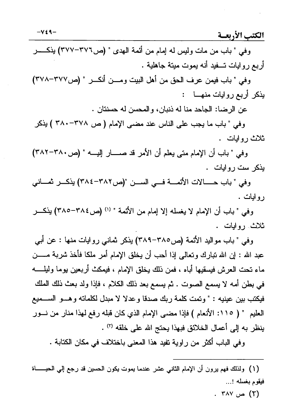 وفي " باب من مات وليس له إمام من أئمة الهدى " (ص376-377) يذكر أربع روايات تفيد أنه يموت ميتة جاهلية.
