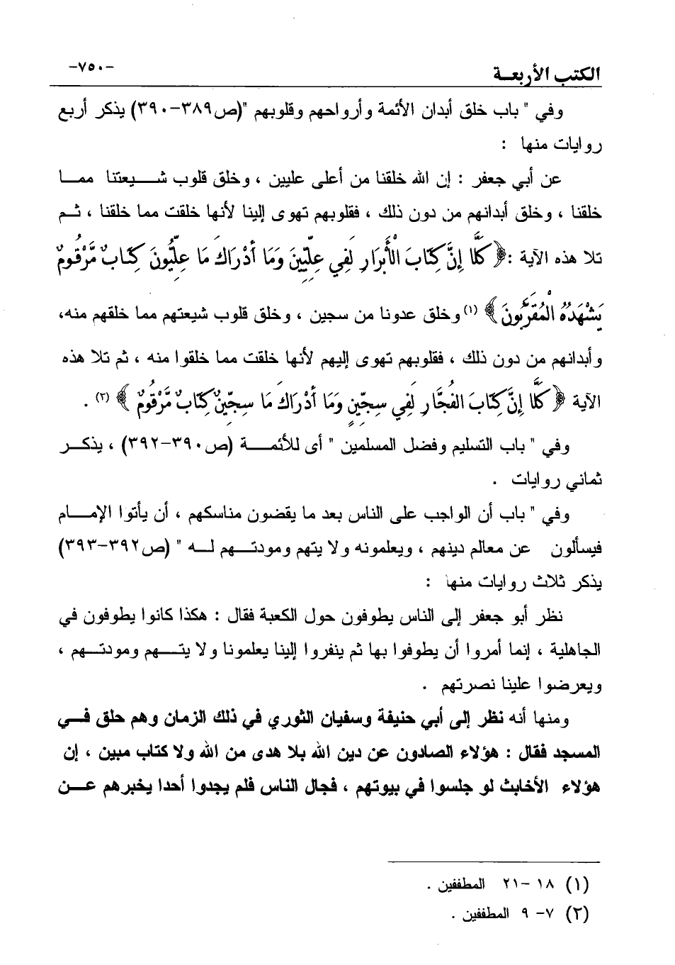 عن أبي جعفر: إن الله خلقنا من أعلى عليين، وخلق قلوب شيعتنا مما خلقنا، وخلق أبدانهم من دون ذلك، فقلوبهم تهوى إلينا لأنها خلقت مما خلقنا، ثم تلا هذه الآية:] كَلَّا إِنَّ كِتَابَ الْأَبْرَارِ لَفِي عِلِّيِّينَ وَمَا أَدْرَاكَ مَا عِلِّيُّونَ كِتَابٌ مَّرْقُومٌ يَشْهَدُهُ الْمُقَرَّبُونَ [ (¬1) وخلق عدونا من سجين، وخلق قلوب شيعتهم مما خلقهم منه، وأبدانهم من دون ذلك، فقلوبهم تهوى إليهم لأنها خلقت مما خلقوا منه، ثم تلا هذه الآية] كَلَّا إِنَّ كِتَابَ الفُجَّارِ لَفِي سِجِّينٍ وَمَا أَدْرَاكَ مَا سِجِّينٌ كِتَابٌ مَّرْقُومٌ [ (¬2) .