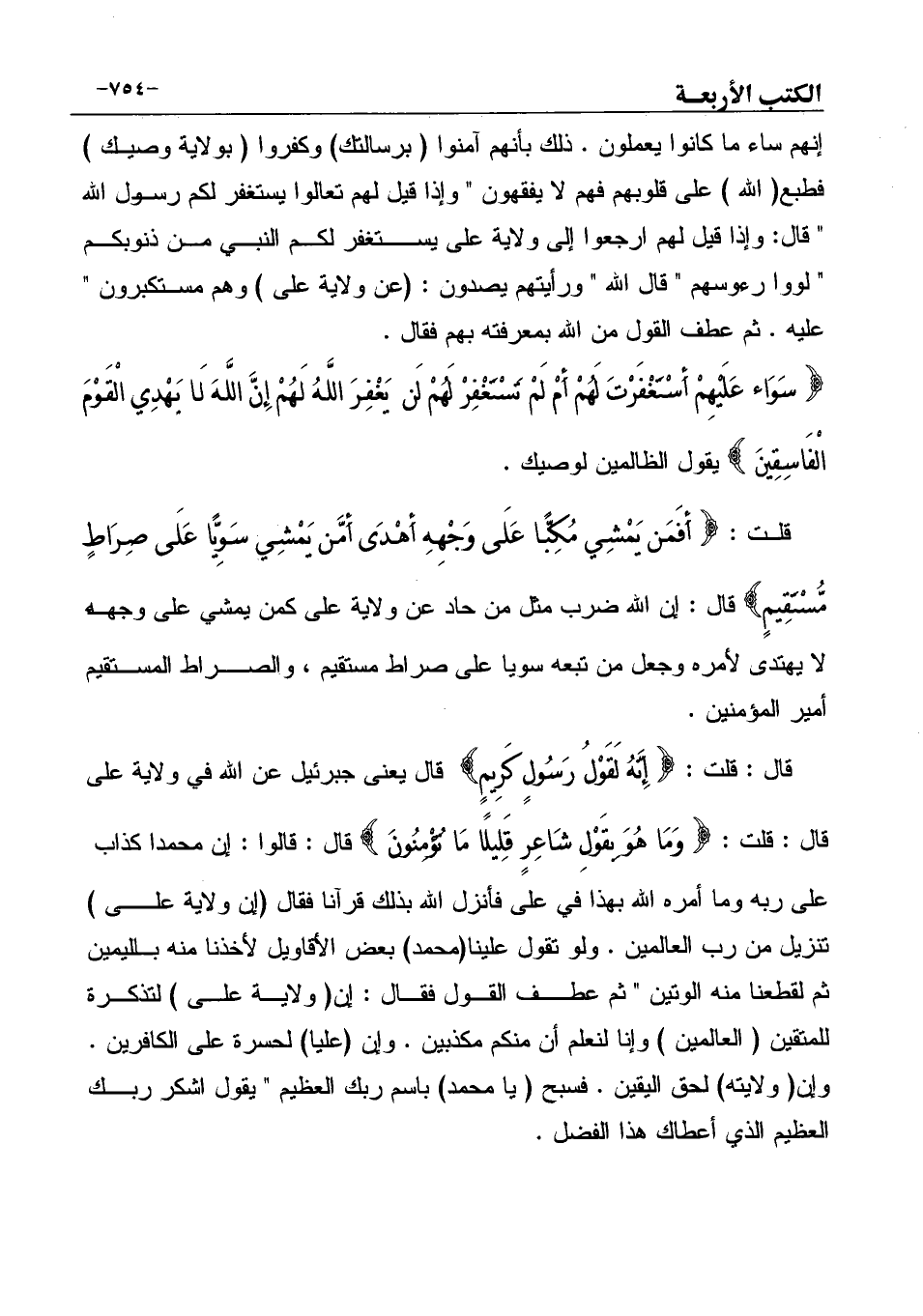 قلت:] أَفَمَن يَمْشِي مُكِبًّا عَلَى وَجْهِهِ أَهْدَى أَمَّن يَمْشِي سَوِيًّا عَلَى صِرَاطٍ مُّسْتَقِيمٍ [قال: إن الله ضرب مثل من حاد عن ولاية على كمن يمشي على وجهه لا يهتدى لأمره وجعل من تبعه سويا على صراط مستقيم، والصراط المستقيم أمير المؤمنين.