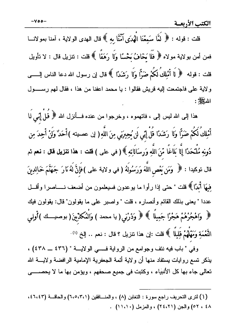 هذا إلى الله ليس إلى، فاتهموه، وخرجوا من عنده فأنزل الله] قُلْ إِنِّي لَا أَمْلِكُ لَكُمْ ضَرًّا وَلَا رَشَدًا قُلْ إِنِّي لَن يُجِيرَنِي مِنَ اللَّهِ (إن عصيته) أَحَدٌ وَلَنْ أَجِدَ مِن دُونِهِ مُلْتَحَدًا إِلَّا بَلَاغًا مِّنَ اللَّهِ وَرِسَالَاتِهِ [ (في على) قلت: هذا تنزيل قال: نعم ثم قال توكيدا:] وَمَن يَعْصِ اللَّهَ وَرَسُولَهُ (في ولاية على) فَإِنَّ لَهُ نَارَ جَهَنَّمَ خَالِدِينَ فِيهَا أَبَدًا [قلت " حتى إذا رأوا ما يوعدون فسيعلمون من أضعف ناصرا وأقل عددا " يعنى بذلك القائم وأنصاره، قلت " واصبر على ما يقولون" قال: يقولون فيك